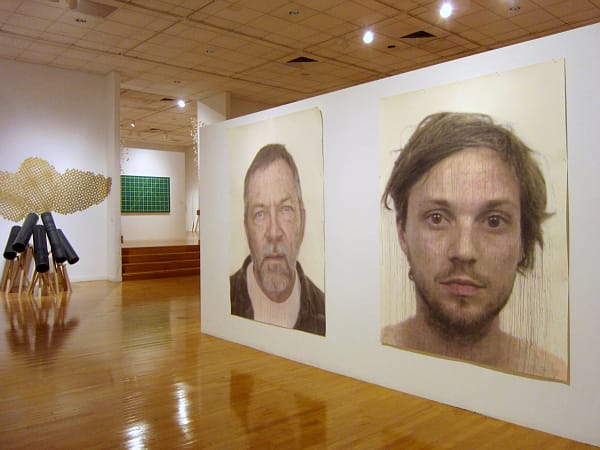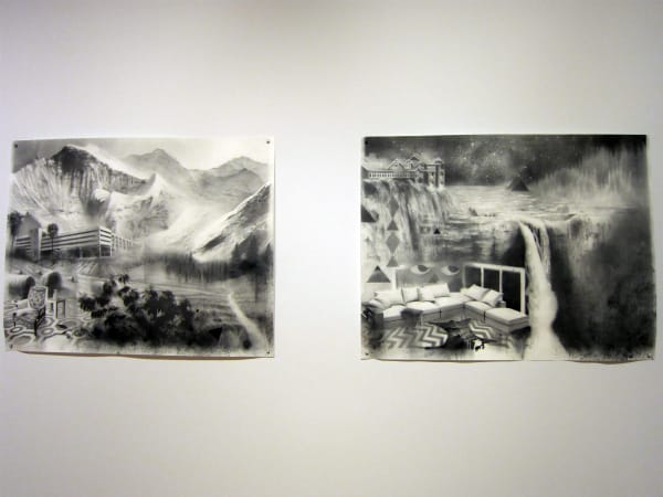 After starting strong with Erik Hougen’s streaked, photorealistic watercolor portraits of himself and his dad (top), the two-dimensional work largely lost me with tired abstraction and forced surrealism. I was drawn to two detailed graphite and charcoal works by Brian Scott Campbell, “Before the Sighting (After Brecht)” and the Twin Peaks-inspired “Ben Horne’s Lodge,” mixing landscapes and interiors into a foggy dream.