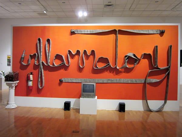 It’s impossible to ignore Nicky Enright’s “Inflammatory,” as it is literally yelling at you from a screen where the word and definition of “inflammatory” are shouted through a megaphone. While the twisted firehose makes for a great picture and would have been clever on its own, the addition of the TV, fire extinguishers, and even a box of matches each labeled “Rome Was Not Burnt in a Day” was overkill.