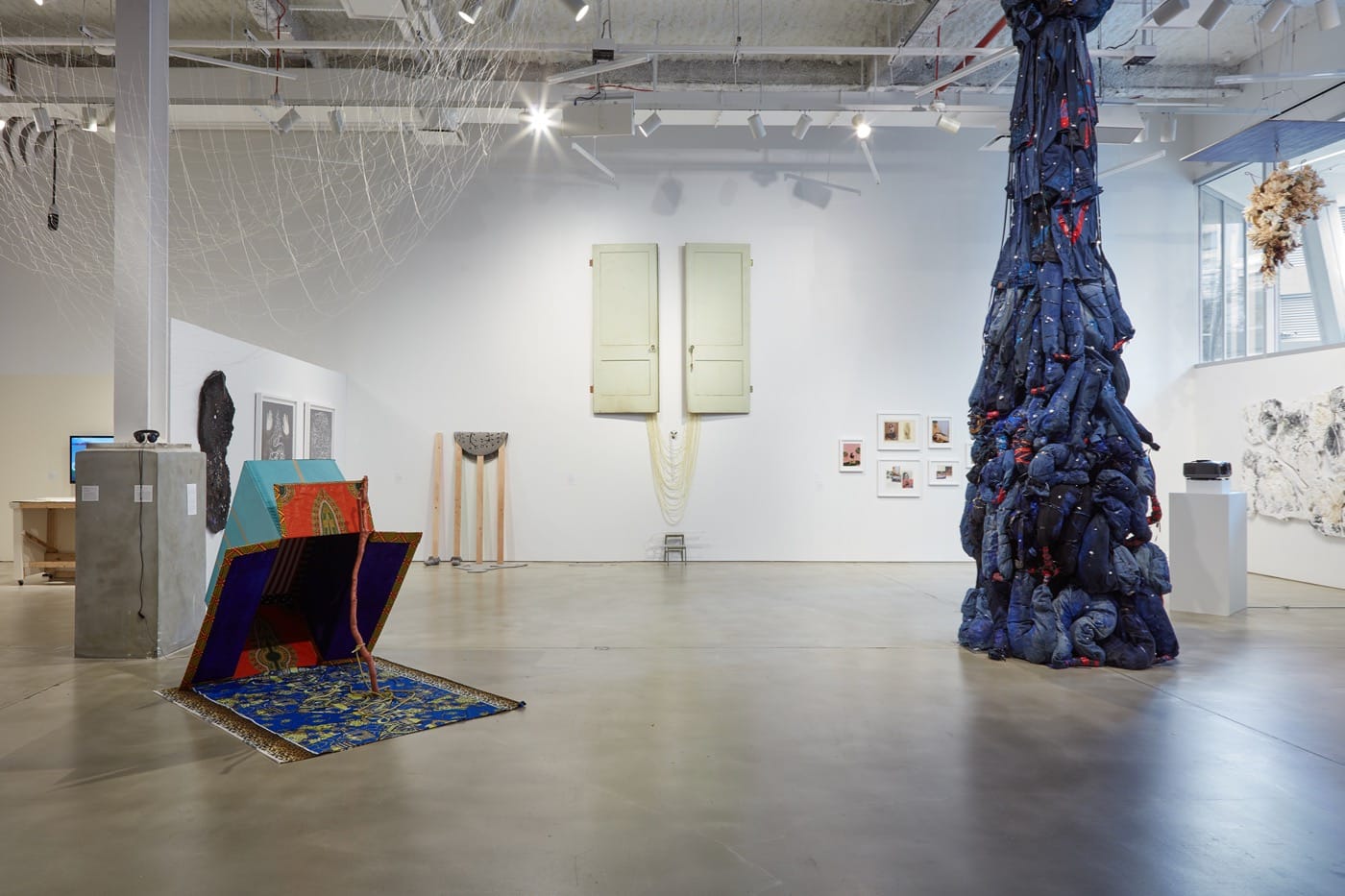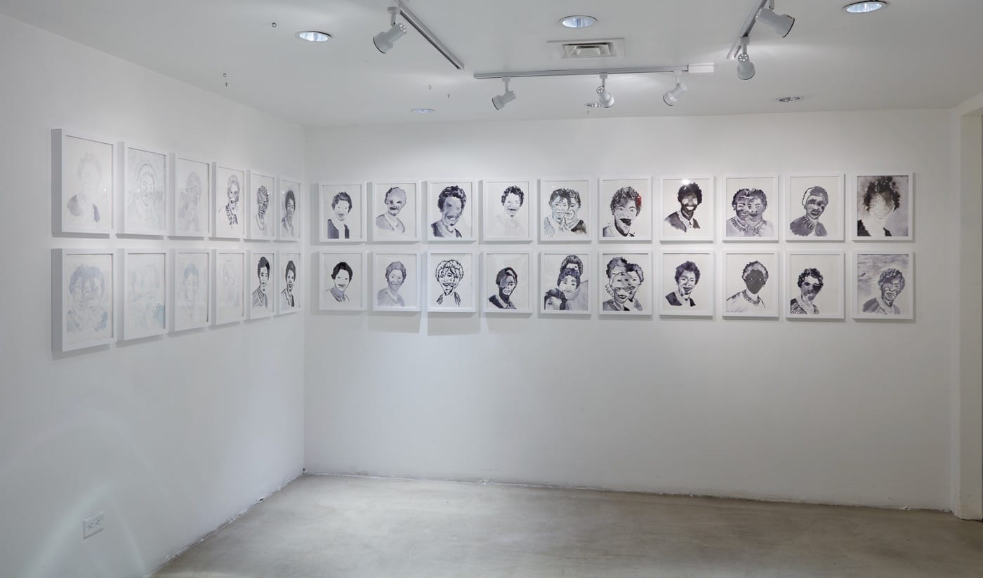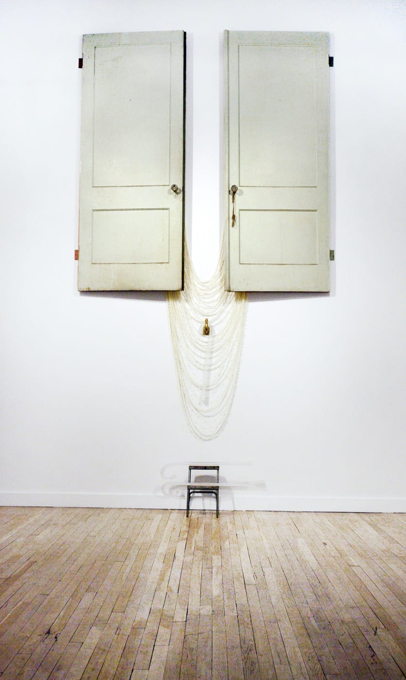 One artist, Kambui Olujimi, asks you to think back to the woman who cared for you as a child. Did she wear a string of pearls around her neck? Did she dote on you and make you feel loved? Did she walk with a cane? Did she eventually seem brittle and prone to injury? Olujimi encompasses all these impressions in an elegiac tribute to a woman, a friend who cared for him for many years, Catherine Arline. His piece, “I Knew You Before You Was Born” (2016) makes that person larger than life, using the actual doors taken from Arline’s home, which are placed on a wall, in such a way as to suggest a torso, with long strands of artificial pearls hanging between them further affirming this reading. He also adds several glass canes which make Arline’s fragility transparent. This installation hangs in the main theater space, while on the first floor he presents a long series of watercolor portraits of Arline. These images convey the sense that Olujimi looked at his subject carefully and attentively for long periods of time, and then at odd moments out of his eyes’ corners, to reproduce Arline as a set of distinct moods, aspects, and demeanors.