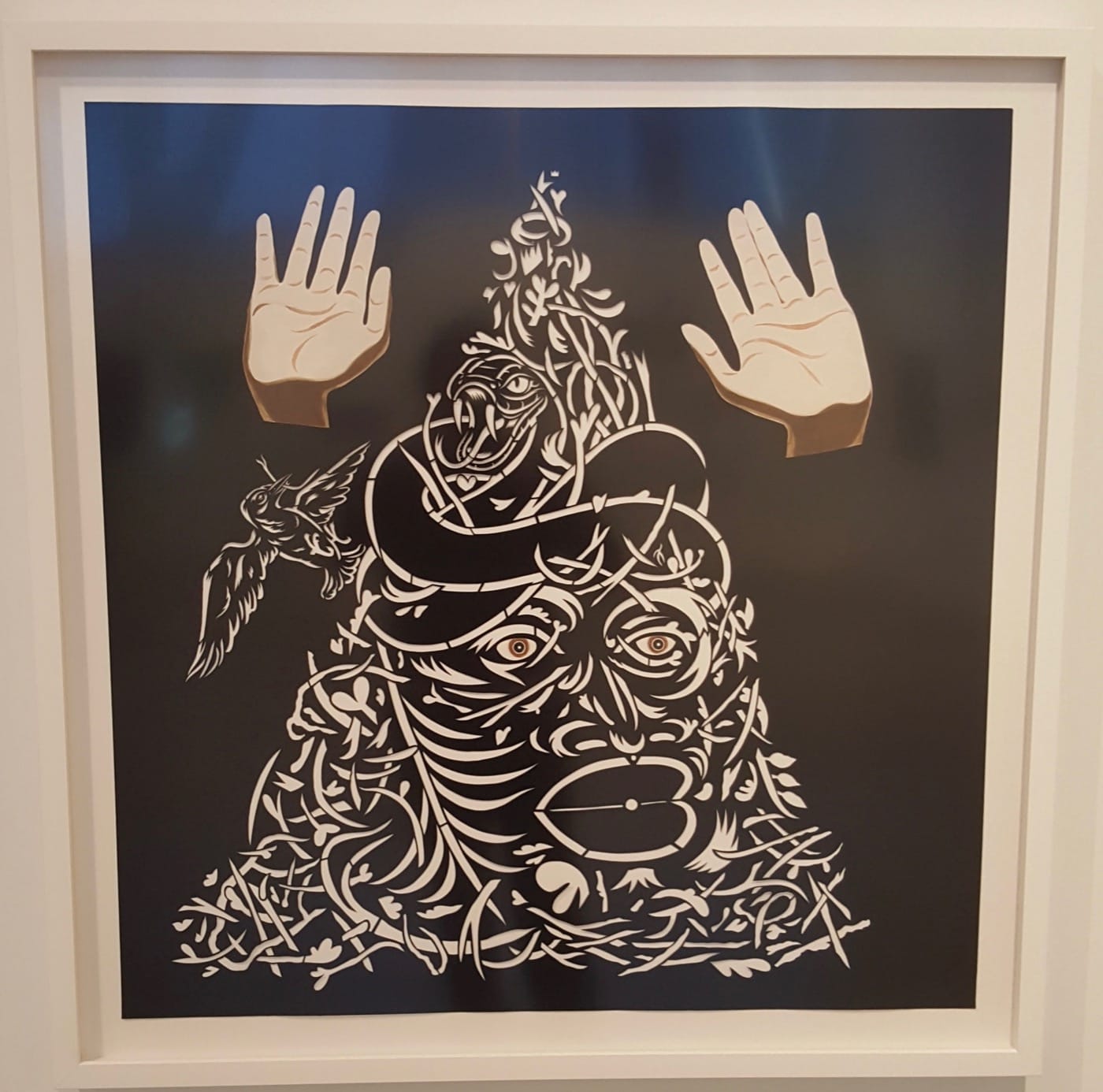 The other artist in the show whose work seems most evocative of the theme is William Villalongo. His portraits consist of cut velour paper on matte board and take a very different approach from the art by Jimenez and Olujimi. Villalongo’s images are imaginary, it is said in the accompanying wall text, confected from Yoruba ceremonial masks and animal figures. “Strong Medicine” (2016) depicts an image of raised palms, as if in surrender. His faces are compelling because they are fugitive, hidden in the decorative patterns that make up the background from which they may (depending on who you are and how you look at things) emerge into visibility. They linger on that threshold of being seen or misapprehended and, bravely, they allow either response to be their reception.