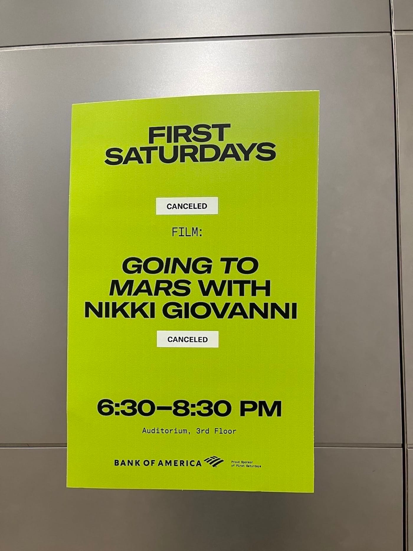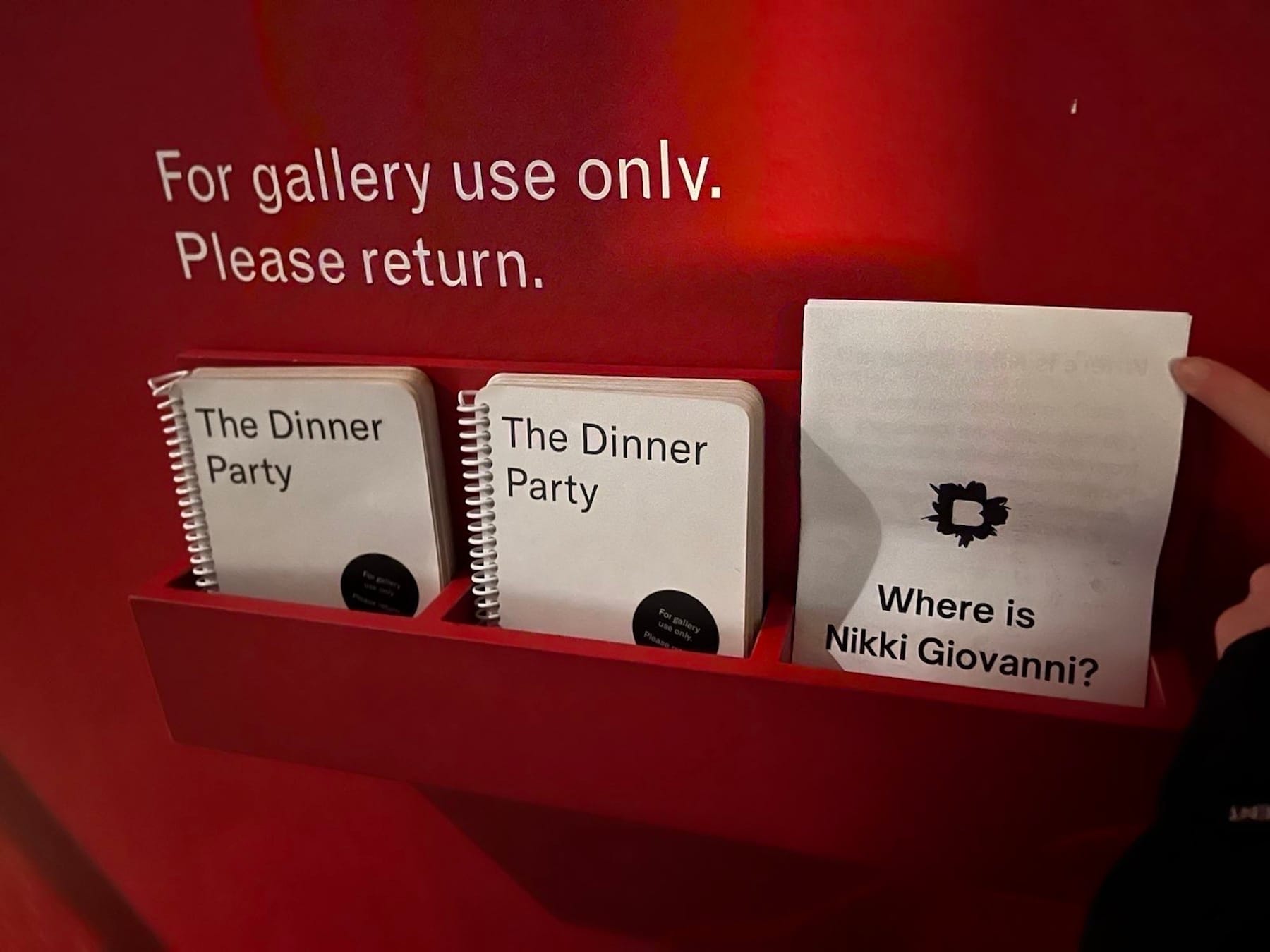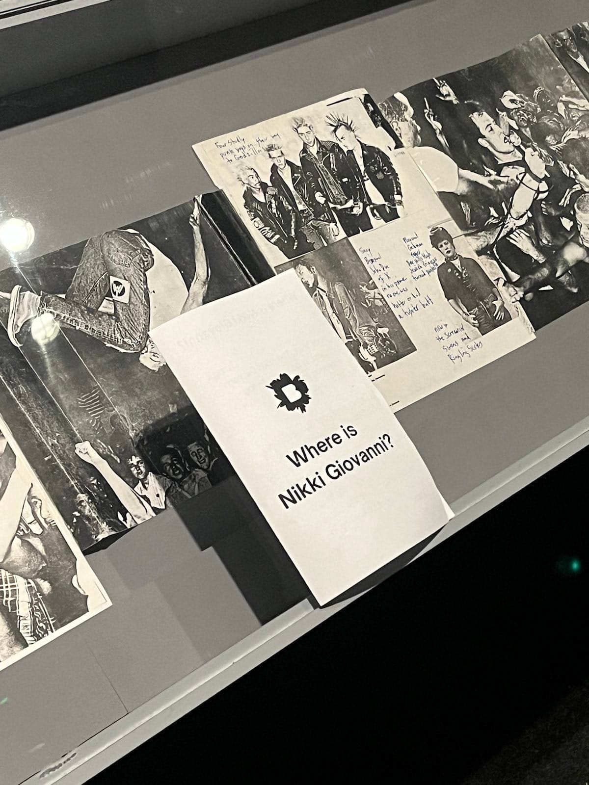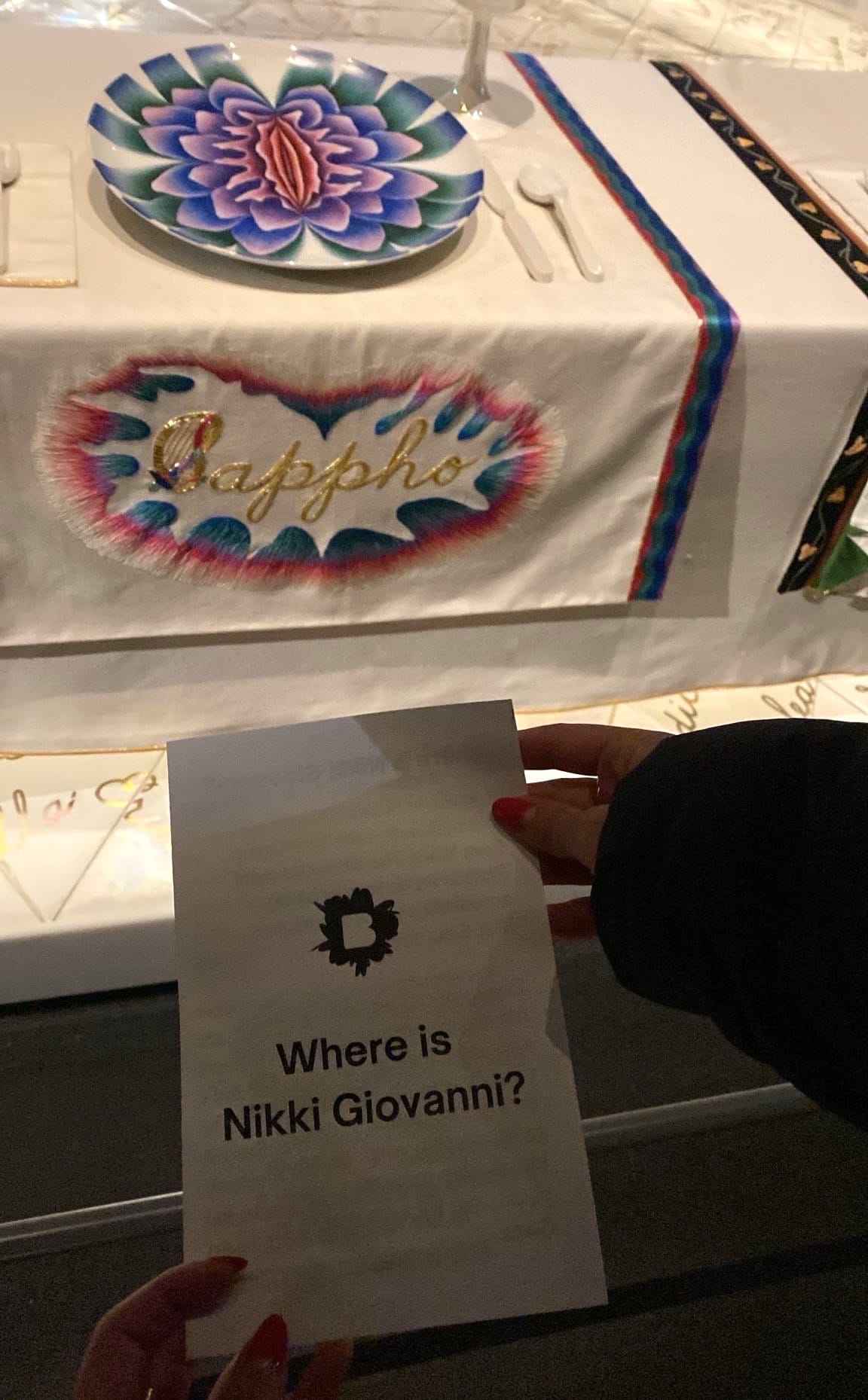 In lieu of the screening and discussion, on Saturday, March 2, a group of activists took to the Brooklyn Museum and discreetly distributed zines to visitors. The black-and-white leaflets, printed with the question “Where is Nikki Giovanni?,” were also covertly placed throughout the museum, such as in the brochure cases for Judy Chicago's installation The Dinner Party (1974–79) and atop display cases in the exhibition Copy Machine Manifestos: Artists Who Make Zines.