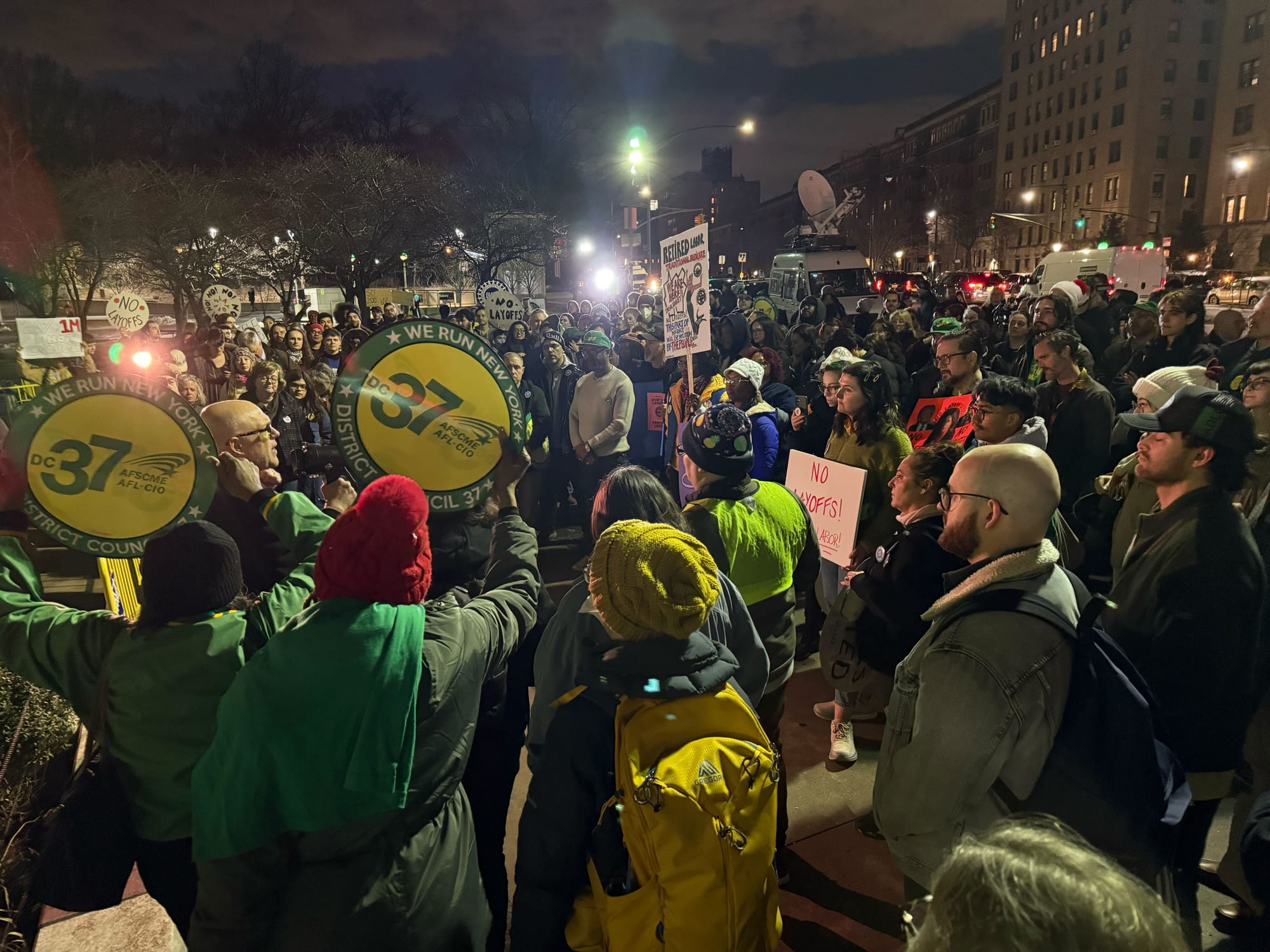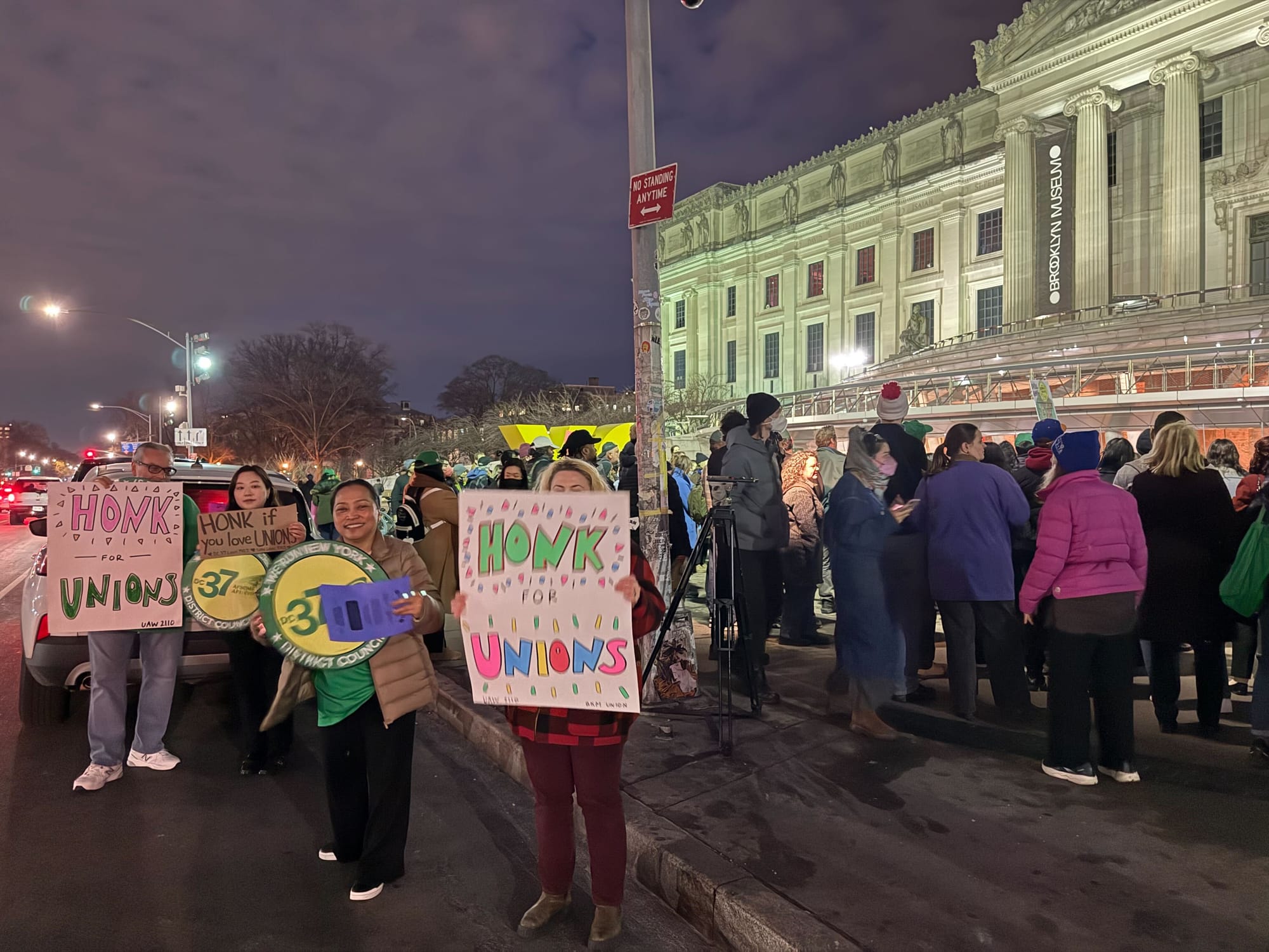 The rally was organized by District Council 37 Local 1502 and UAW Local 2110, the two unions representing workers at the Brooklyn Museum, which decried leadership’s decision to cut workers across departments without attempting to negotiate with their respective bargaining units or offering buyouts or furloughs.