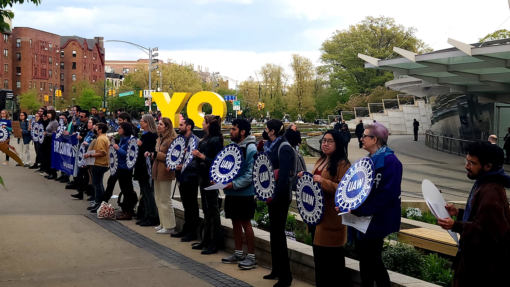 The picketers and union staffers marched in line with signs while someone from Local 2110 UAW chanted "overworked and underpaid," and other such slogans into a bullhorn. No music this time, except for the din of passing cars honking in support. Supporters from the Brooklyn Academy of Music's (BAM) union and other friends of the museum were on the scene as well, demanding fair wages for the staff.