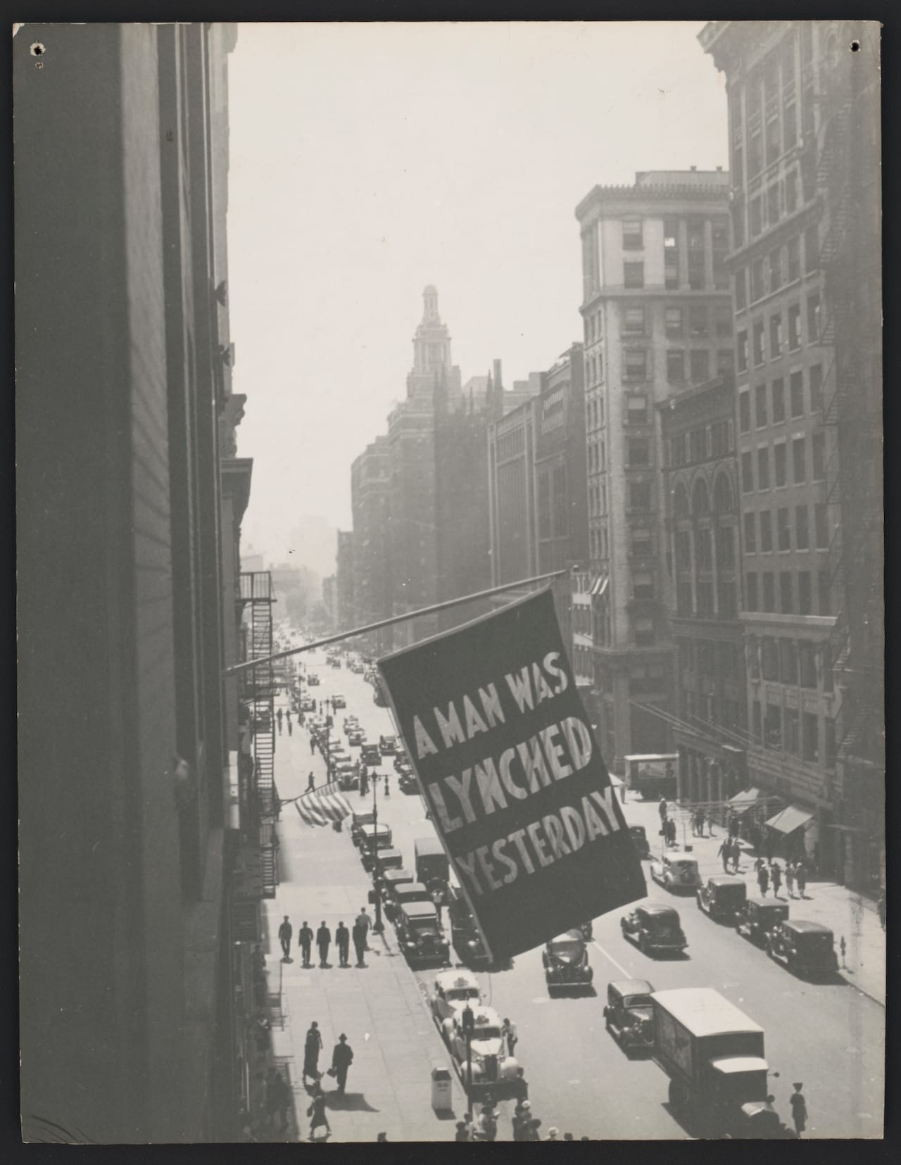 There are a few sections in the show where the curatorial scheme works more effectively. Two photographs of Dread Scott’s performance “On the Impossibility of Freedom in a Country Founded on Slavery and Genocide” (2014) are presented in close proximity to the exhibition’s display of anti-lynching material. The wall text states that around 4,000 African Americans were lynched between 1877 and 1950 (others, including art historian Dora Apel, believe the figure might be closer to 5,000). Here the connection between the historic and the contemporary is far more pointed, since Scott incorporated the gestures of both the Black Lives Matter and Civil Rights’ movements in his performance.