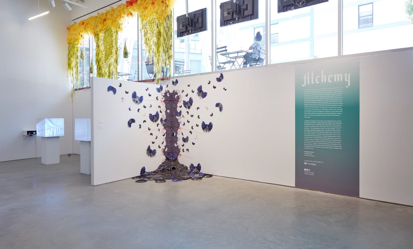 With Nicole Awai’s “Persistent Resistance of the Liquid Land” (2018) the viewer is offered a visually captivating installation plus the story of how the artist came to conceptualize the piece — which makes seeing it a doubly rich experience. “Persistent Resistance” is only one of the pieces in a show of seven artists titled Alchemy, currently on view at BRIC in Brooklyn, but in its material evocation of something ethereal, it most compelled me to spend time with it.