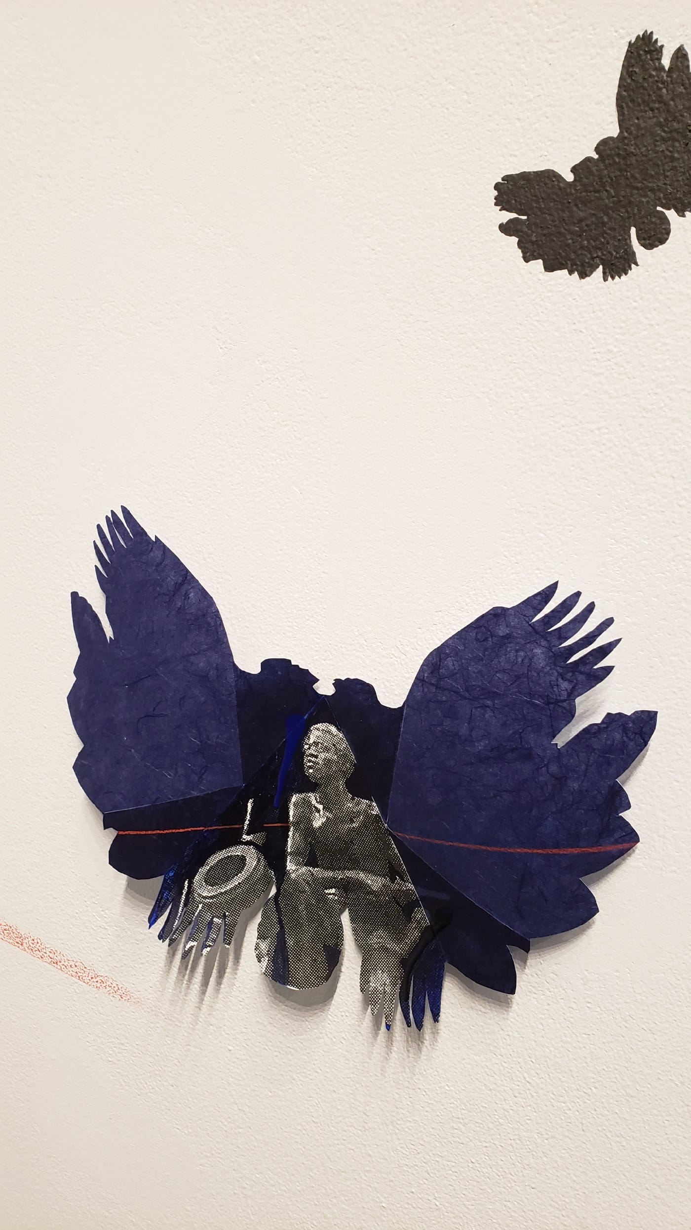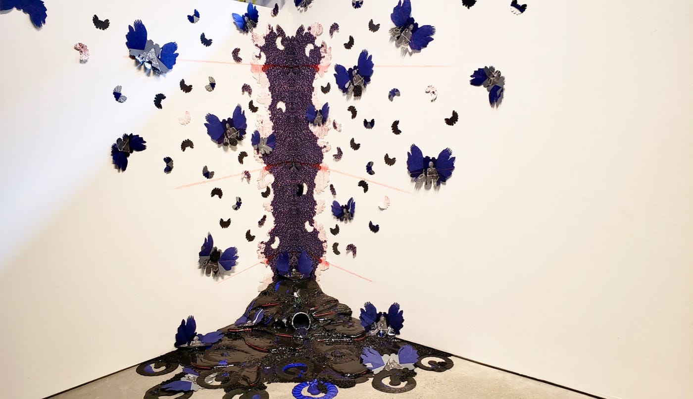 Radiating out of a corner of the gallery, “Persistent Resistance” consists of a central speckled, decorative column that looks like a Rorschach ink blot that’s been stretched into a pillar. Beneath it pooled on the floor, as if still in the process of cooling, is a pour of asphalt, resin, charcoal, nail polish over foam — lushly iridescent. Around the pillar, all over the two walls are repeating butterfly-like paper shapes in dark blue, black, and gray (with some of the smaller ones in a pinkish hue). They vary in size, but the larger ones have a gray-tone image of the crouching soldier in the middle of them. These are hybrid creatures, reimagined cherubim or seraphim that flutter and float awaiting their marching orders.