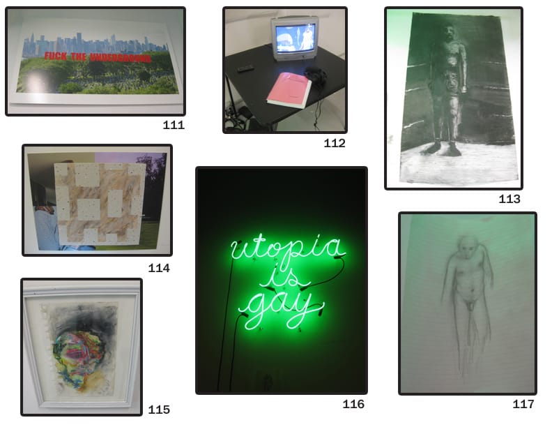 And the review marches on with art reviews a plenty in the seemingly impossible task of reviewing the whole Brucennial. Today’s installment reaches #175: 111. Kathe Burkhart - FUCK THE UNDERGROUND. Exactly.; 112. Dolores Haydon - The horror of porn. The porn of horror. Cool the way the scissors and