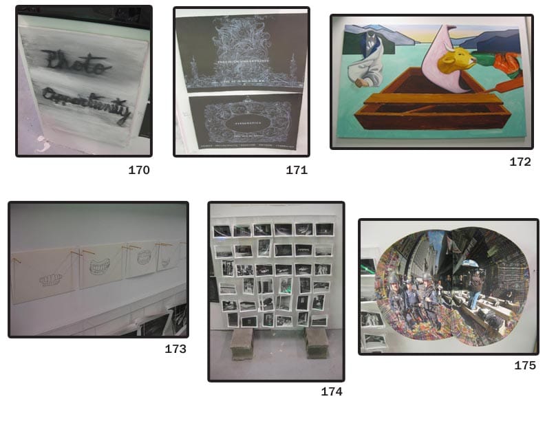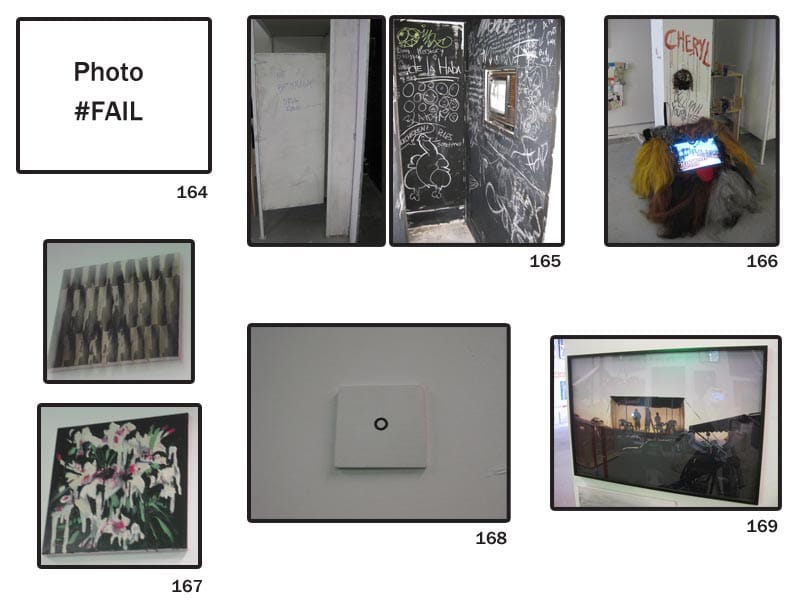 167. Rosson Crow – OK. Officially a Rosson Crow fan. Why so high on the wall though? I think I like the large paintings at Deitch better, but these’ll do (And I might be wrong about this inequity, looking back.). The abstract on top reminds me of a close-up of one of the Twin Towers. Or is the flowery one more abstract? Tastily confused I was.
