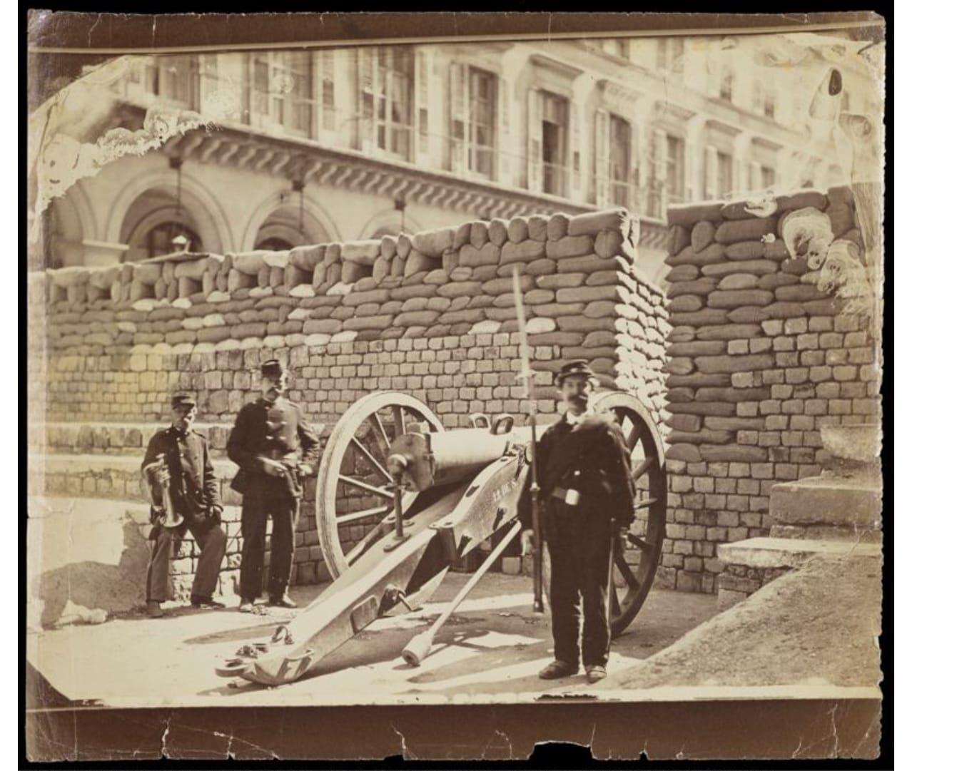 As Paris turned on the Third Republic government, officials fled the city. In the vacuum of power, the National Guard seized strategic buildings. In Braquehais’s photo, Communards stand proudly by a cannon at the Rue de Castiglione, in a city they now controlled. By March 19, only one day later, they raised a red flag of victory over the Hôtel de Ville. The Commune was born.