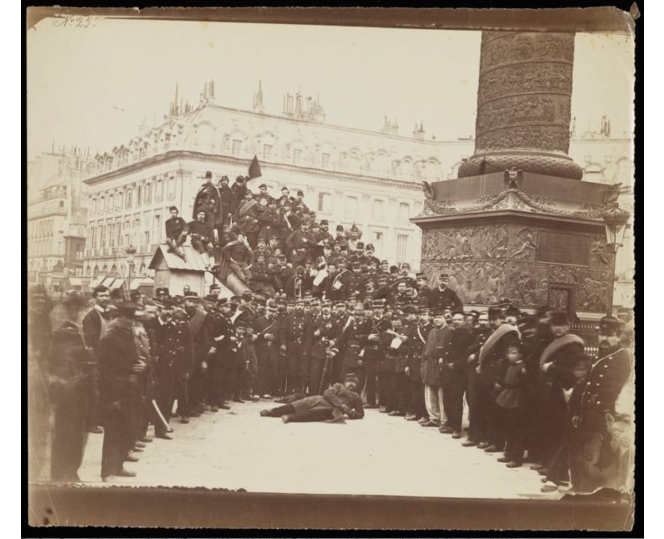 The Commune also resolved to tear down certain monuments. Their biggest target was the Vendôme Column, a 130-foot-tall pillar topped with a statue of Napoleon in Roman garb, and ringed with bronze plates made from the cannons of armies he had conquered. The Commune viewed it as a symbol of imperialism. On May 16, the column was pulled down to great fanfare. Once again, Braquehais was on hand to capture the event. The dust had barely cleared before spectators rushed in to grab souvenirs and take photos, including this large group portrait Braquehais took of Communards as they struck humorous poses in front of the former emperor’s monument to himself.