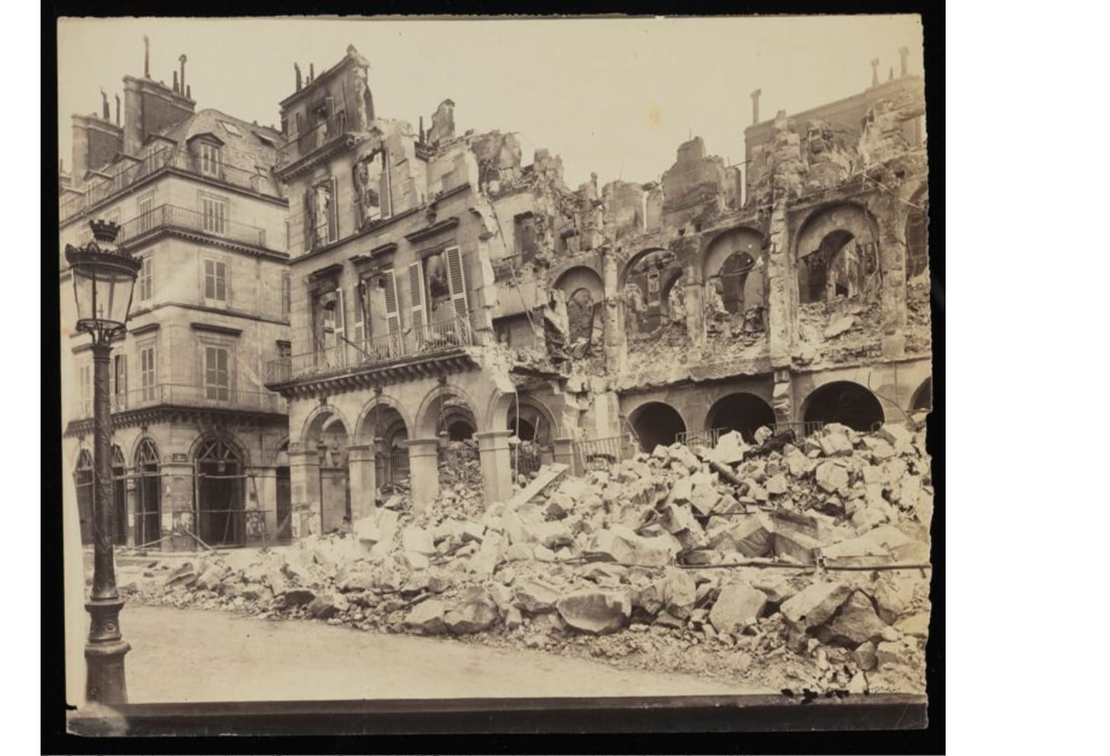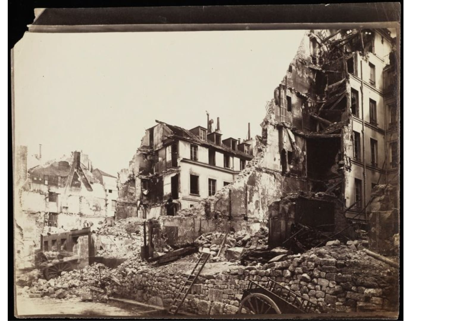The tragedy of the Commune led many people in France and abroad to seek out photographic souvenirs of the events. But the French government monitored these images closely, censoring photos that might lead to disturbances of the public peace. Images of ruined buildings were acceptable, but portraits of people were scrutinized: they could only depict Communards in a negative, criminal light, and furthermore, they were often used to hunt down those who had participated. Braquehais published his images in an album, but unlike other photographers, he did not include any accompanying text to give judgement on the Commune — an absence that has been read as a subtle sign of his pro-Commune sympathies.