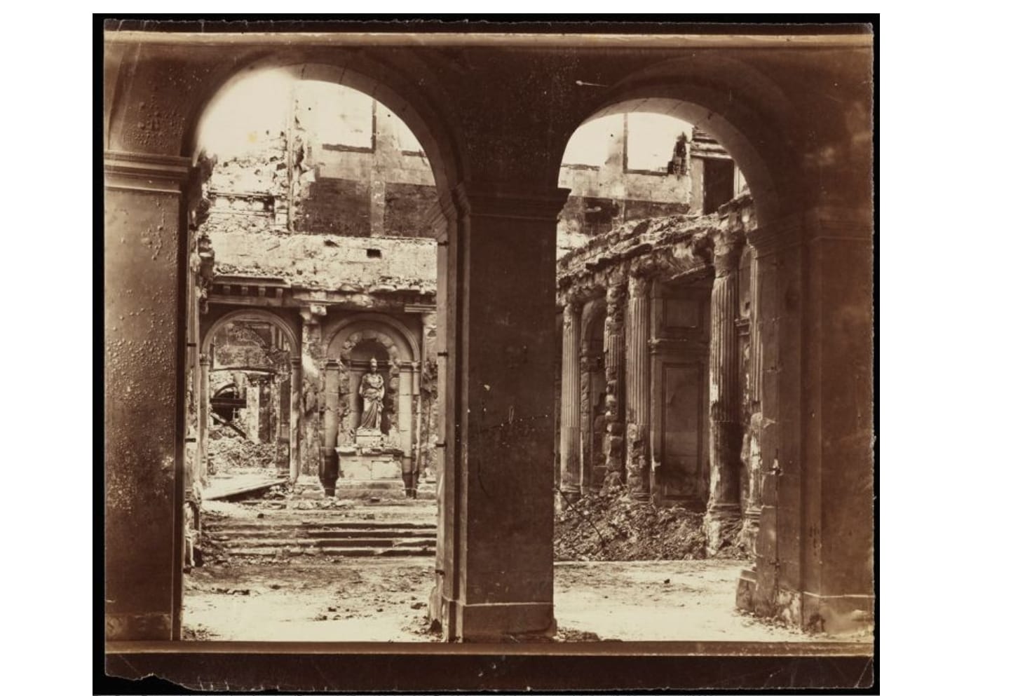 In response, the National Guard set fire to major landmarks, including the palace of the Tuileries, the traditional residence of French monarchs. Braquehais framed this image of the palace’s destruction around a statue of the Roman war god Mars, seen in the background, as a commentary on the violence. Between the two sides, Paris was almost totally destroyed.