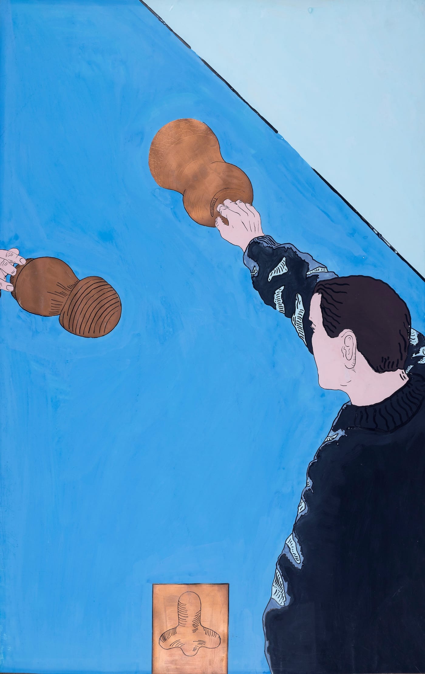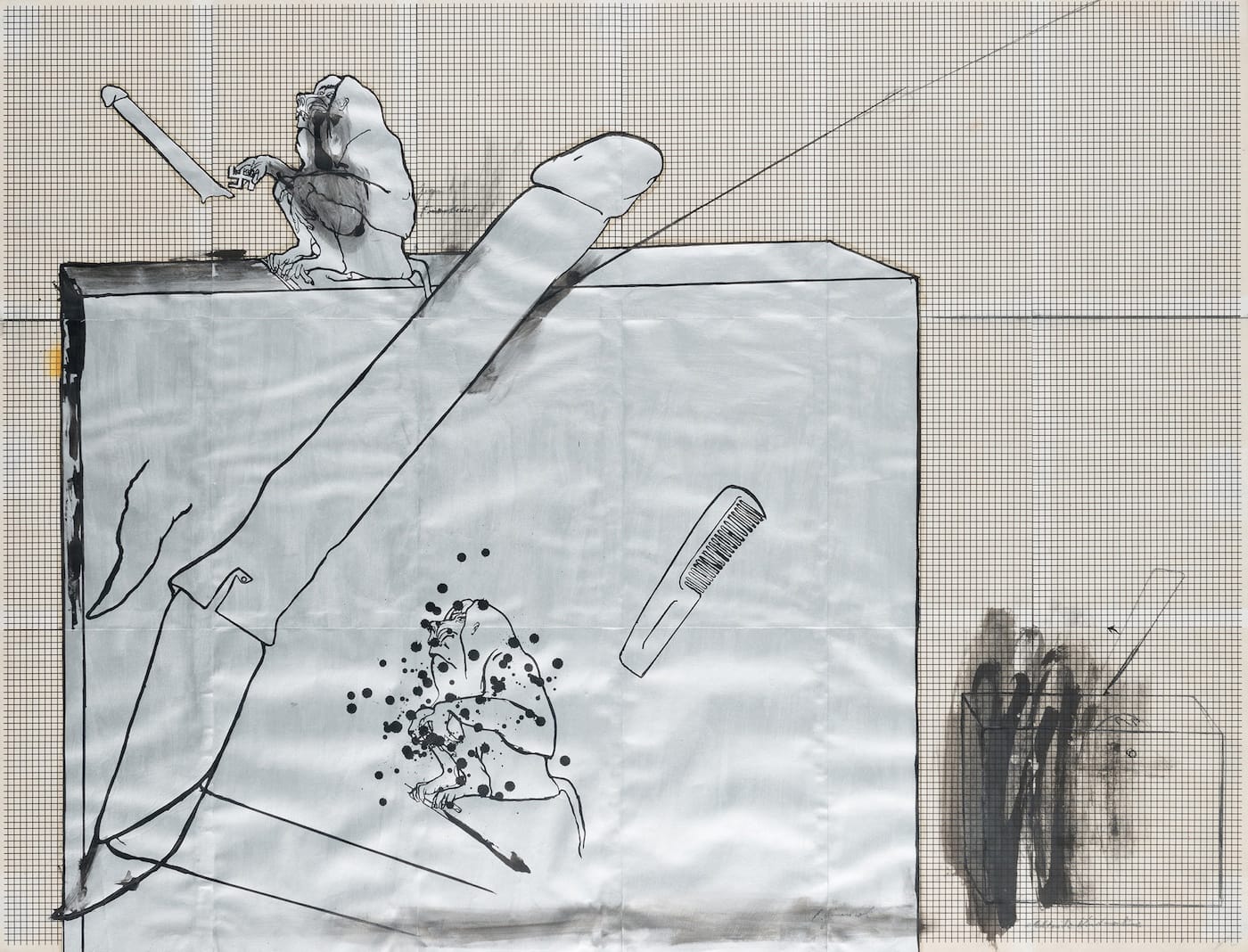 And as if they were closing an argument, there are other drawings that reiterate the artist’s sculptural forms while adding a cast of characters — blue-suited men (Murphy, Robert, and the Apprentice, cited above), bandaged mummies, skull-topped totems, copulating dogs, and onanistic baboons, among others — who use those forms as a setting for often unpleasant acts.