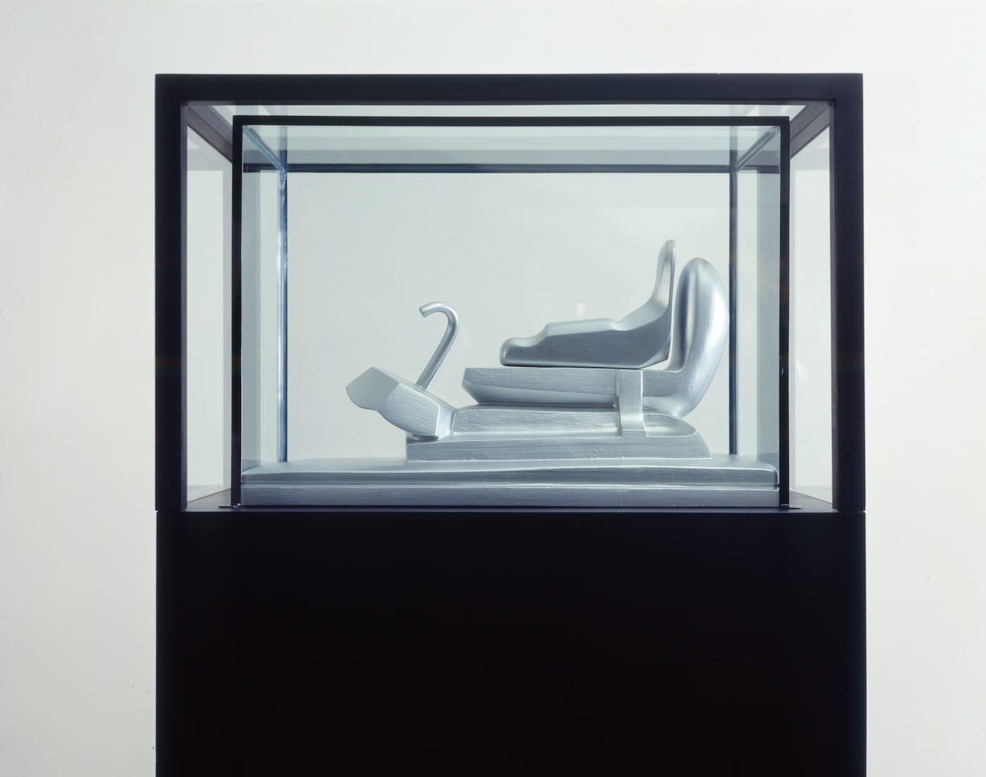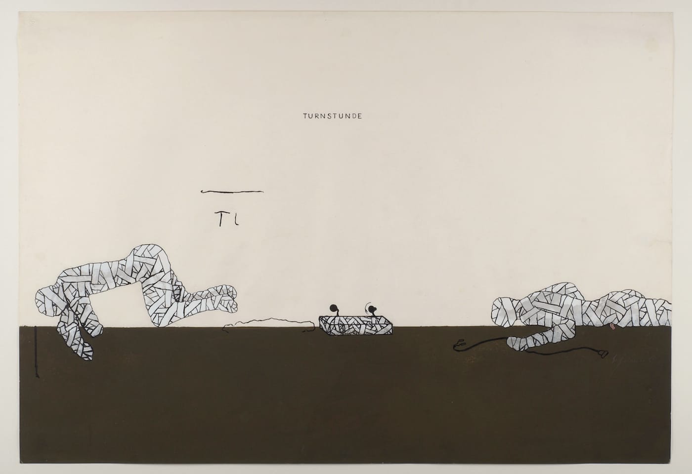 Rather, she begins her text with a page-long discussion of the novel Murphy (1938) by Samuel Beckett, whose writing Gironcoli discovered in Paris (where he was also exposed to the Existentialism of Jean-Paul Sartre). Murphy is a valid point of departure due to the decisive role it played in Gironcoli’s evolution — he adopted its title for one of his early sculptures, a cast aluminum piece with a silver finish inside of a black vitrine, which includes the stylized forms of a figure, a bed or chaise, and an inverted umbrella (“Model in Vitrine, Design for a Figure [Murphy],” 1968). He also has used the name Murphy, along with “Robert” and “the Apprentice,” to identify the blue-suited men squirreling through many of his works on paper.