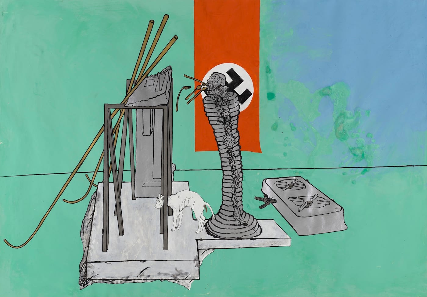 The soul-sinking dread seeping through Gironcoli’s imagery, propelled by the force of history and underscored by the occasional swastika, cropping up like a horsefly in your pastry, amid the tableaux of dogs, men, and baboons, is emphatically more now than then. As our claims to postwar enlightenment or exceptionalism grow more tenuous by the day, Gironcoli offers a reverse angle shot conflating a past he knew too well with a future he wouldn’t live to see. It’s a pitiless vision of who we are, crowded with grim hallucinations and grimmer jokes that nevertheless — through startling combinations of color and form in the service of unfettered imaginings — manage to feel lighter than air.