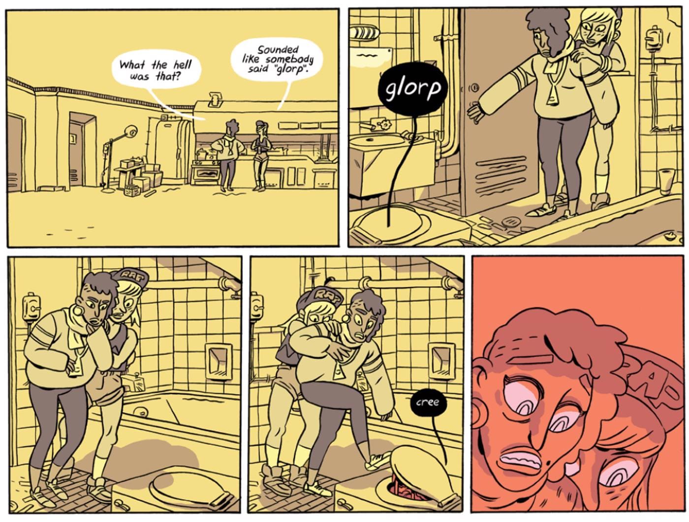 This is an under-examined but distinct realm of fiction, drawing on the unique elements of apartment living. Other examples include Cronenberg’s Shivers, Ballard’s High-Rise and its film adaptation, Otomo’s graphic novel Domu: A Child’s Dream and his film World Apartment Horror. The contradictions of experiencing simultaneous isolation and inextricably united community have been fodder for writers ever since the rapid increase in urbanization after World War II. An apartment is your home, but also just a few rooms. You are cut off from those around you, even as hundreds or even thousands of people are stacked together in one building. Such a setting can easily shift from familiar to sinister, as urban density becomes a trap. Such is the growing spookiness in BTTM FDRS, which melds social horror with body horror, as the thing in the apartment building integrates its inhabitants, the gentrified space literally consuming humanity.