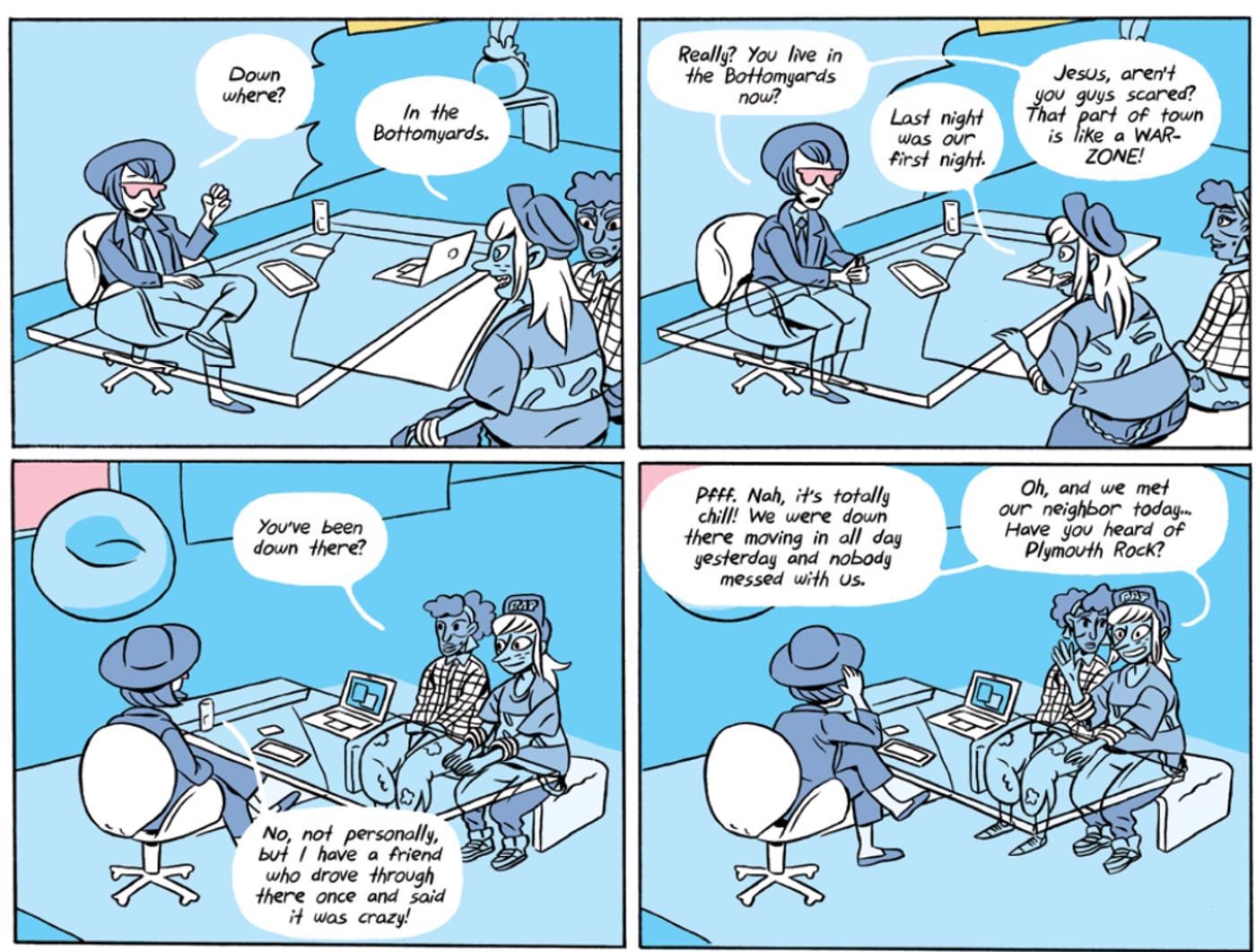 Bottomyards is a rundown area now getting its first taste of “renewal,” as landlords are beginning to lure in well-off outsiders with cheap rents. One new move-in is Darla, an aspiring fashion designer with a complicated relationship to the place. She’s originally from there, but her upwardly mobile family then moved out, and she’s since grown up in wealthier (and much whiter) environs. She’s contrasted with her white BFF Cynthia, who’s almost stereotypical in her enthusiasm for the “authenticity” of the neighborhood. Darla’s mixture of ambition, guilt, and reticence over the frictions between her Blackness, status, career, and relationships with her friends and family forms the backbone of the story’s arc. While there are plenty of broad (and funny) jabs at artwashing, hipsters, and both NIMBYs and YIMBYs, the book doesn’t settle for an easy examination of the issues at hand.