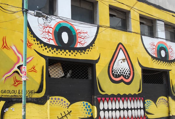 Most street artists work under the constant fear of arrest, but in Buenos Aires muralists take their time and paint in broad daylight. When you’re used to other laws, graffiti artists painting quickly and at night, Argentinean artists’ total comfort is strange to see, like people drinking on the street. As the Argentinean muralist Jaz Grafitero says, “painting with total freedom turns us into muralists not vandals.” Interestingly, most Argentinean muralists regularly show in local galleries, apparently unaware of the common distinction between illegal and commercial art.