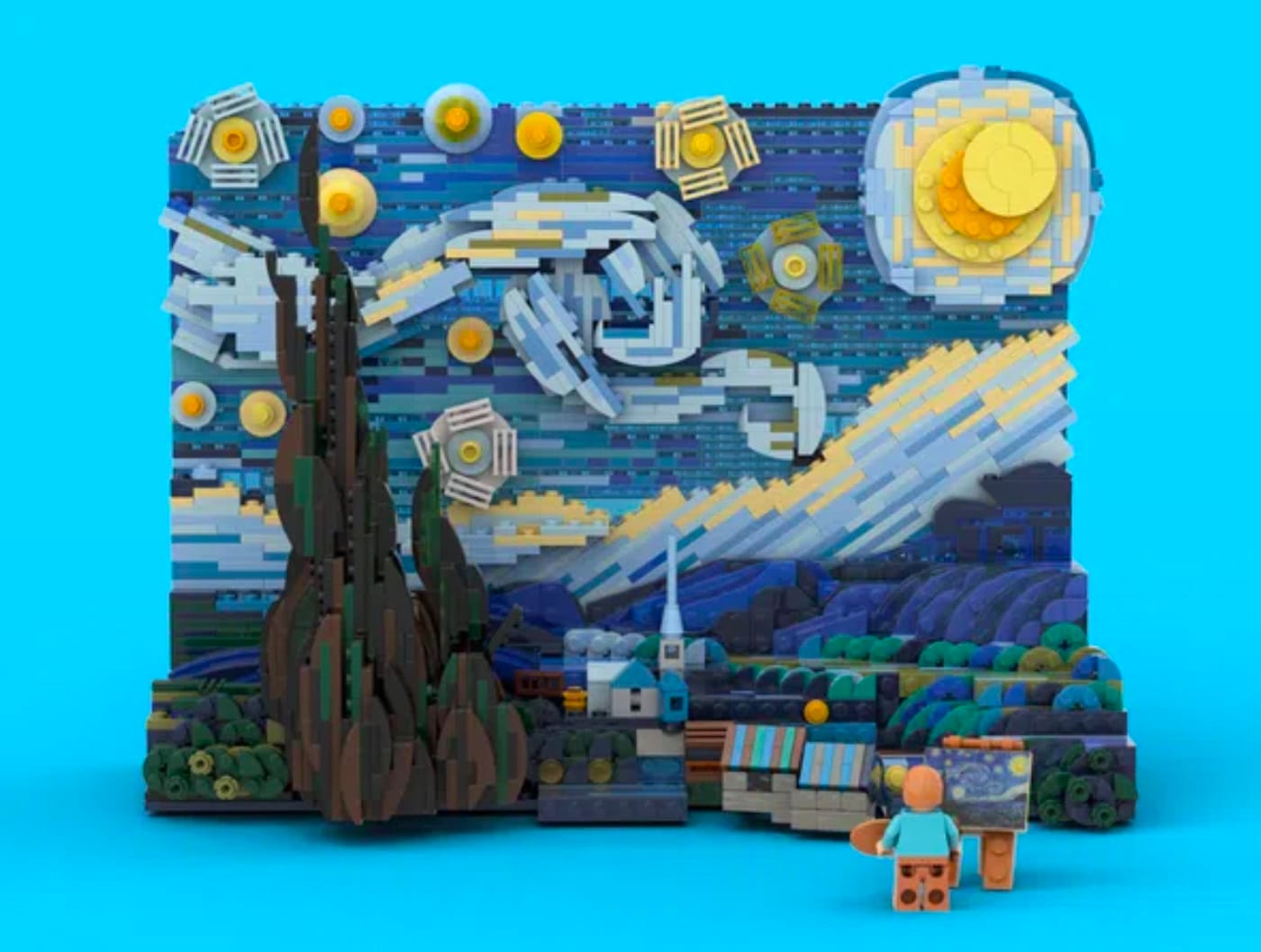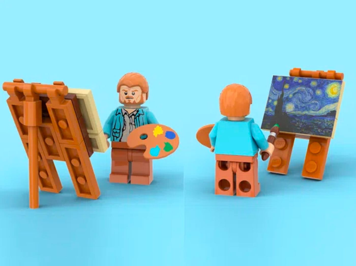 I’m not here to argue that LEGO can be art — I will simply let the evidence speak for itself on that topic. I’m just here to let you know, one mature LEGO fan to another, that the latest from LEGO Ideas takes the world’s most popular building block system to new artistic heights. Vincent van Gogh: The Starry Night has earned the requisite 10,000 fan endorsements on LEGO Ideas and was approved for production. The set assembles a brick-olage of the ever-diversifying arsenal of LEGO blocks into a surprisingly fluid replica of the famous Impressionist painting. Even more meta, the 1,552-piece set includes a van Gogh Minifigure that stands before the set, capturing the painting on a little LEGOgh easel and canvas — revealing the set to be a landscape, and our miniature artist to be indulging in some plein-air painting.