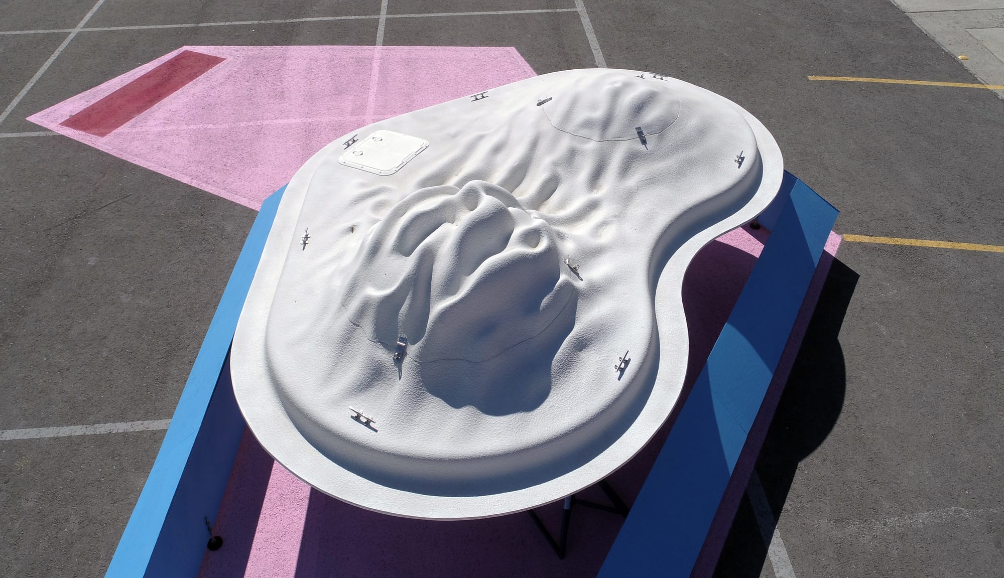 Similarly detailed levels of thought and care can be seen throughout the Float Lab’s elegant design. Because custom fabrication molds produce excessive waste, the Float Lab’s top and bottom halves are made from the same mold, then flipped and rotated to connect. The Lab’s bean shape is also modular, affording multiple Labs the capacity to interlock into a reef-like island. What’s more, each Lab’s exterior contains hooks onto which smaller architectural prototypes can be affixed.