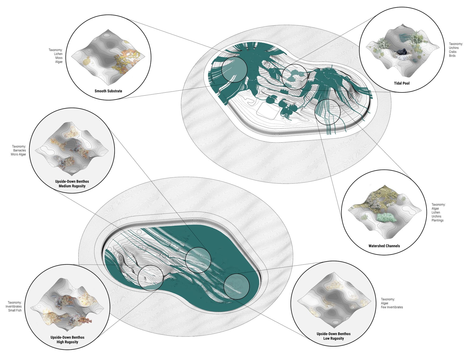 But the conceptual foundations of the Float Lab, and the larger AEL, date to 2014, when Marcus, whose background is in computational design, had his studio architecture students explore “how to optimize more diverse [marine] communities using geometry.” The students’ topographical sketches for artificial marine habitats — ranging from stalactite-esque spikes to curved bridges — catalyzed “a cycle of ideation and testing” with biologists at BL. Those iterative tests showed that ridged and hilly gradients, rather than flat surfaces, are most conducive to marine animal biodiversity.