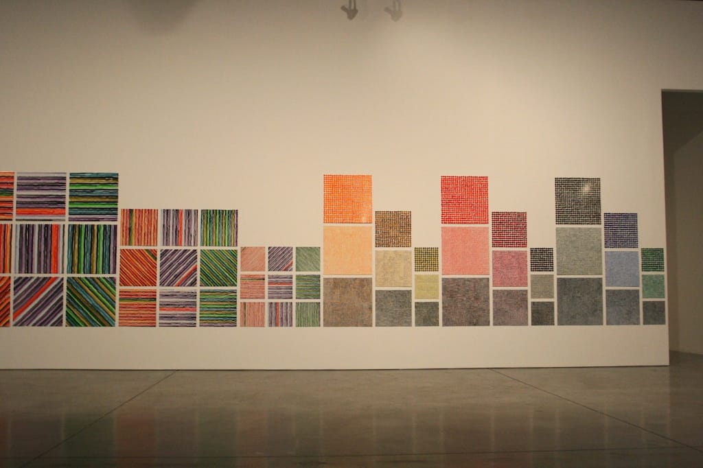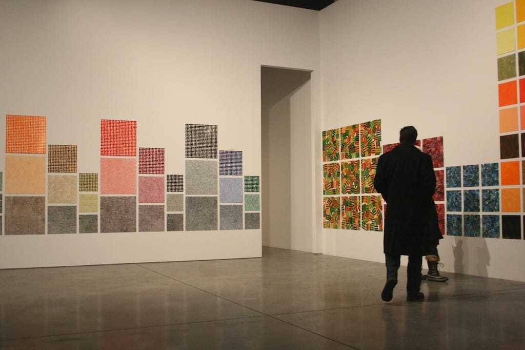 In a gallery cloistered behind the enormous space of “Recitative,” a few of Bartlett’s other works are on display. These smaller series again use pre-set patterns and structures to explore what iteration means to a painter and how a single color shift can impact the overall composition of a work. These function as important background to the artist’s ideas, but the pieces are still only appetizers to the main course. Recitative is engrossing enough on its own. Trust me, you’ll want to save some time to savor it.