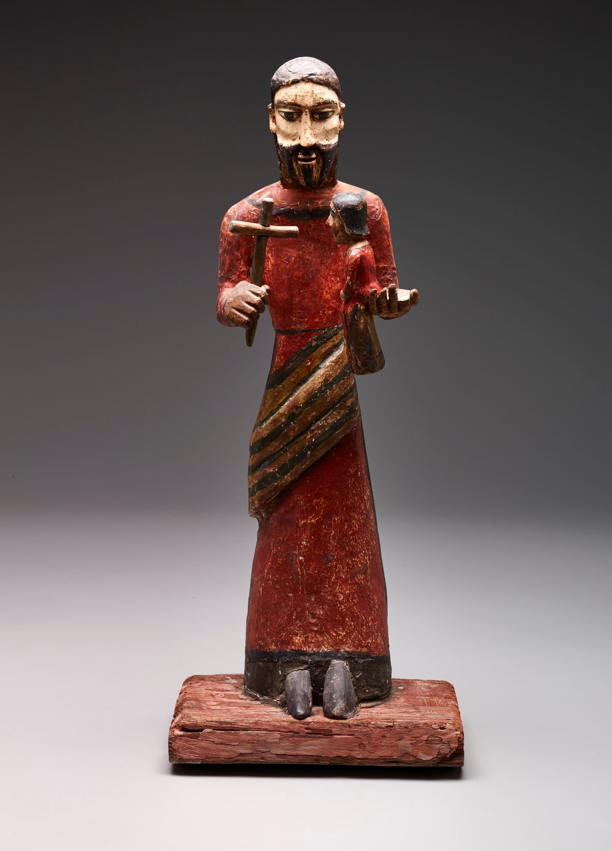 Bultos originated in the Spanish and Indigenous communities of present-day Mexico and New Mexico in the late 1700s, and continue to be a key element of worship in the region. The sculptures are made of cottonwood, aspen, cedar, and other woods, and are often painted and dressed in cloth or leather garments. Kept in church and home altars, bultos share an interactive, physical relationship with their audiences, who touch, kiss, and arrange them during religious rites. For example, the arms of “Our Father Jesus of the Nazarene,” a late 19th-century bulto by Juan Ramón Velásquez, feature moveable joints that could be repositioned to hold offerings or other props during important liturgical events like Holy Week. If a particularly crucial favor is not granted, a bulto may be turned around or removed from its altar or even destroyed.