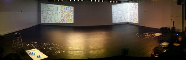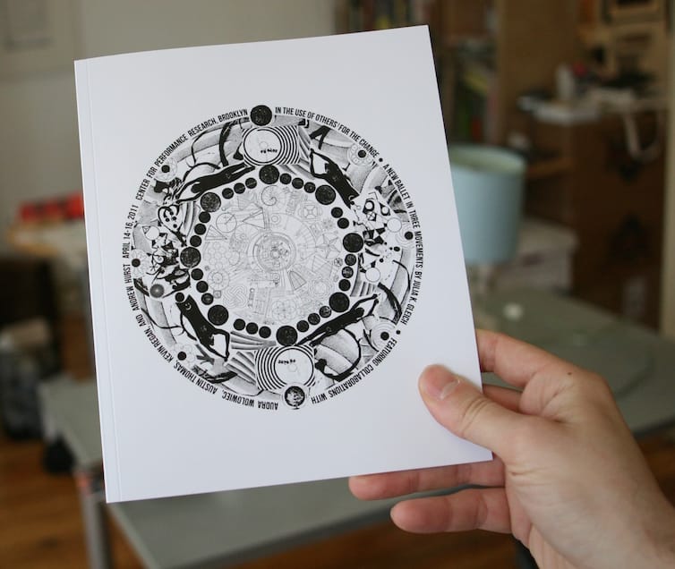 In the local elemetary school gym rented by Jason [Andrew], we created loose and free, projection, improvisation and sound. The image used on the event poster captured by Lars Kremer, set up the casual yet intense focus on building choreography. I like how Andrew [Hurst] collects ideas and I think I do the same in my choreography. Only my ideas don’t take on visible form until the dancers enliven them.