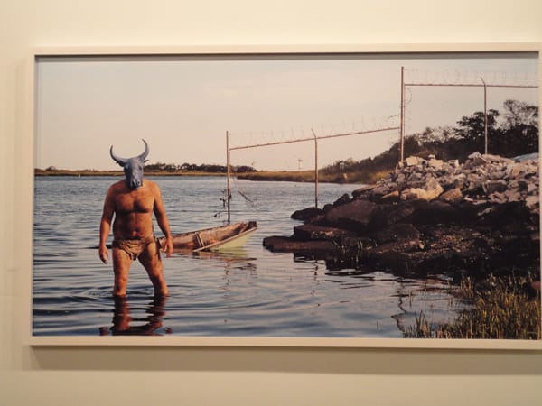A menacing minotaur threatens viewers at the English Killls Gallery. Rob Andrews’s “End of Empire” (2011) takes the villain of Greek myth and plops him into an eerie lake scene from modern times. The background has some unusual details that reward close looking: a coiled electric fence, a guard tower, a sunken boat. The intense sharp focus of the c-print makes the entire scene look very realistic — if you can suspend disbelief and pretend that a Minotaur actually exists. I love it when photographic technique does magical realism like this.