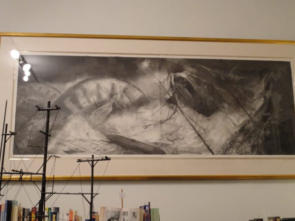 One of the fiercest monsters was the Leviathan at Centotto. In Tim Kent’s charcoal drawing “Leviathan” (2011), an aquatic serpent opens its mouth wide, fiercely flashes its fangs, gyrates its long slithering body and wrecks a ship. Kent employs charcoal’s smokey and smudgy qualities to deftly render the sea’s mist and splashing water. At first glance, the restricted monochromic palette of the charcoal makes it hard to discern where the beast ends and the sea begins. It eventually sharpens into focus, but only after aptly recreating the alarming feeling of confusion at sea for the viewer.