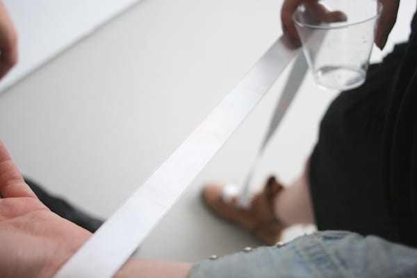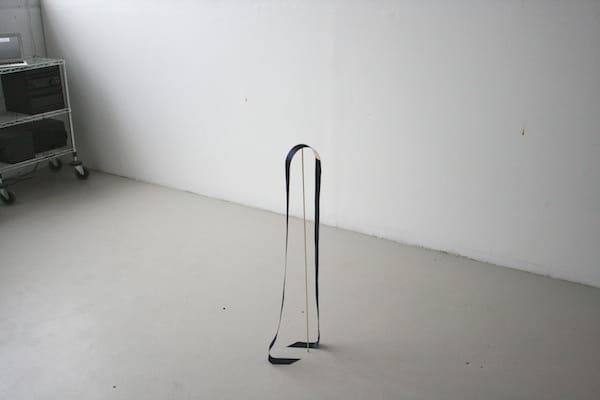 Stephen Lichty was not afraid to go minimal in his studio showing, perhaps the most visually striking work I saw in the building. This single pole balances a strand of ribbon, metallic surface contrasting with the soft fabric. Different sets of ribbons and stands create variations on a minimal theme.