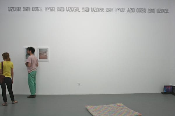 Artist-run gallery space Regina Rex has a group show called Through the Warp up, featuring work by Lawrence Weiner (top of the wall) and others.