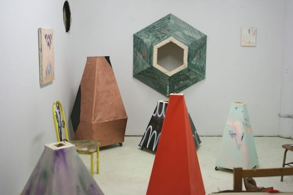 Tatiana Berg’s studio showed off some new entrants into her tent series of paintings. The soft blue tent at right included some glitter finish, but I also liked the thin wash surface of the green monster on the wall.