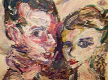 Jim Herbert’s “Naked People” (2010) is painted in oil and hang on the back wall of the English Kills Art Gallery. This detail demonstrates just how many layers of color Herbert can pack onto skin. An analogy to Oskar Kokoschka is tempting but his brushwork creates a thicker density of color and his symbolism invokes a rawer less sublimated take on sexuality.