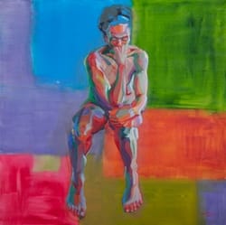 Kazuo Ooka’s massive studio on the fourth floor of the 2 Harrison Street complex featured his recent oil series of multi-chromatic figures modeled after Auguste Rodin’s “The Thinker” (1902). “Thinker #6” is among the strongest in the series. The figure’s musculature is lavishly developed by streaks of green, red, and orange. It’s hard to pull off a background that is bright colorful but still doesn’t compete and divert attention away from the focus of the picture. Ooka knows how to strike a careful compositional balance that produces a wonderful paintings.