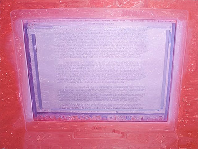 In his vivid gouache paintings, Peter Krashes expounds on his daily political life as a community organizer in Brooklyn. The paintings are all in the small format typical of the medium, save Some Letters Have To Be Written, But Are Best Not Sent, 2010, a seven-foot-wide oil painting of a glowing, red-purple computer screen displaying an open MS Word document. Krashes locates a luscious beauty and a joy for color that politically-driven art rarely displays.