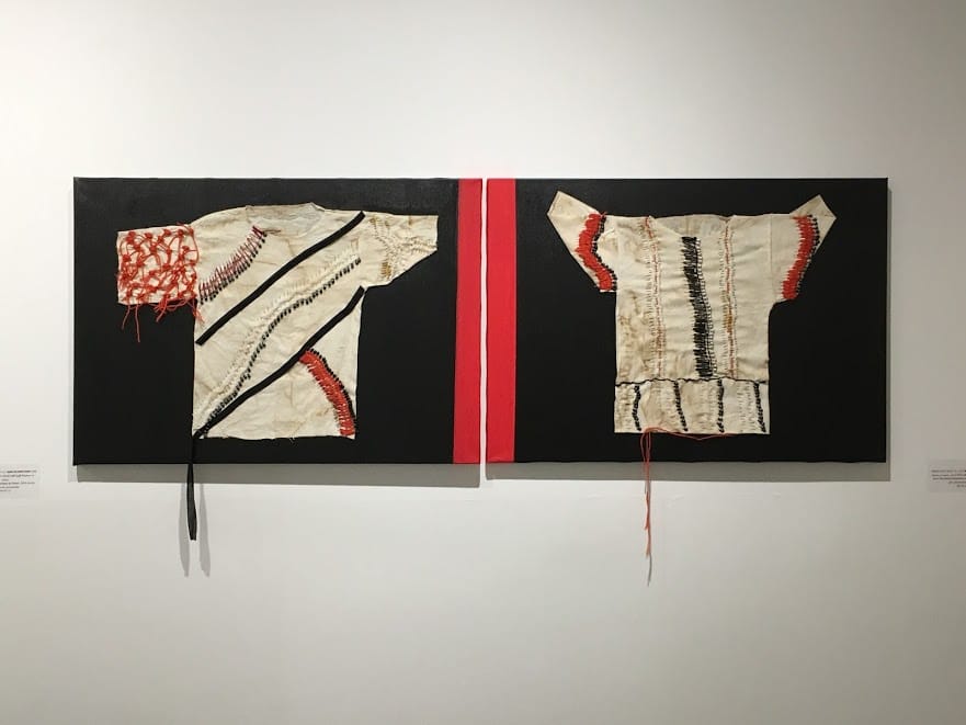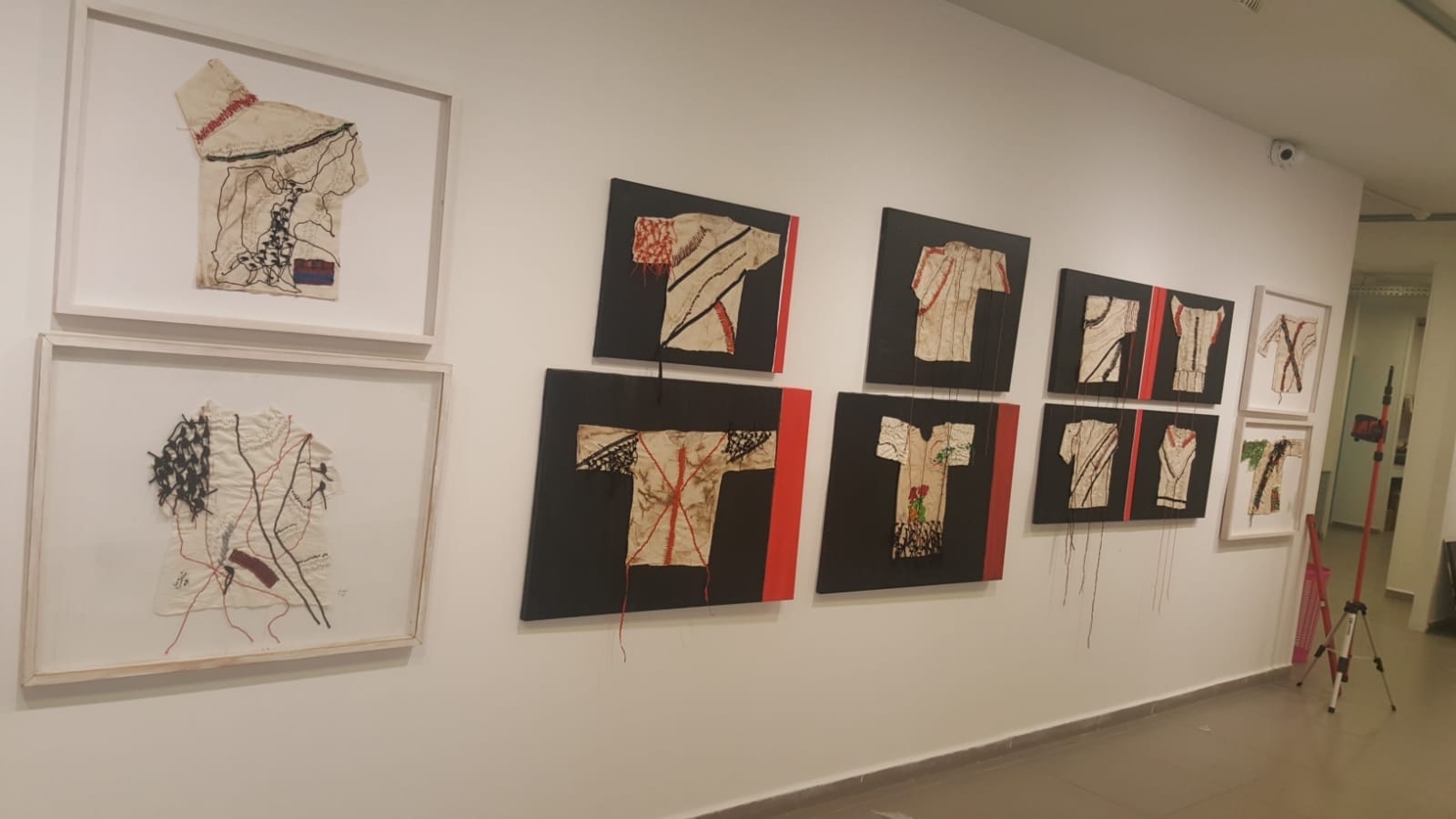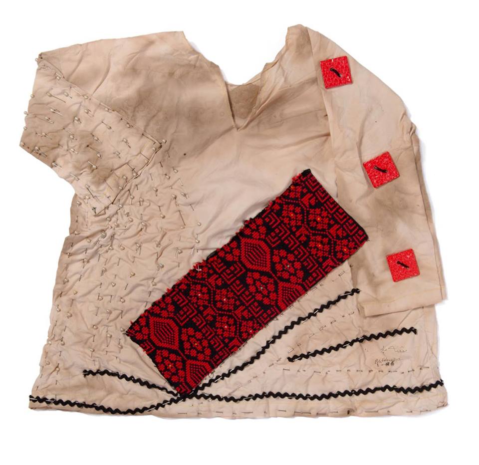UMM EL-FAHEM, Israel — Eighteen years ago, Buthina Abu Milhem cut apart an embroidered dress belonging to her deceased grandmother and began incorporating the fragments into garment-like forms roughly cut from linen. She continued working with dresses purchased in other cities throughout Israel/Palestine. Three series resulting from her ongoing exploration are displayed in her solo exhibition, A Lamentation of Threads and Pins, at the Umm el-Fahem Art Gallery, located in Wadi Ara within the Green Line (the Armistice, or pre-1967, border drawn in 1949 demarcating the de facto borders of the state of Israel after the war).