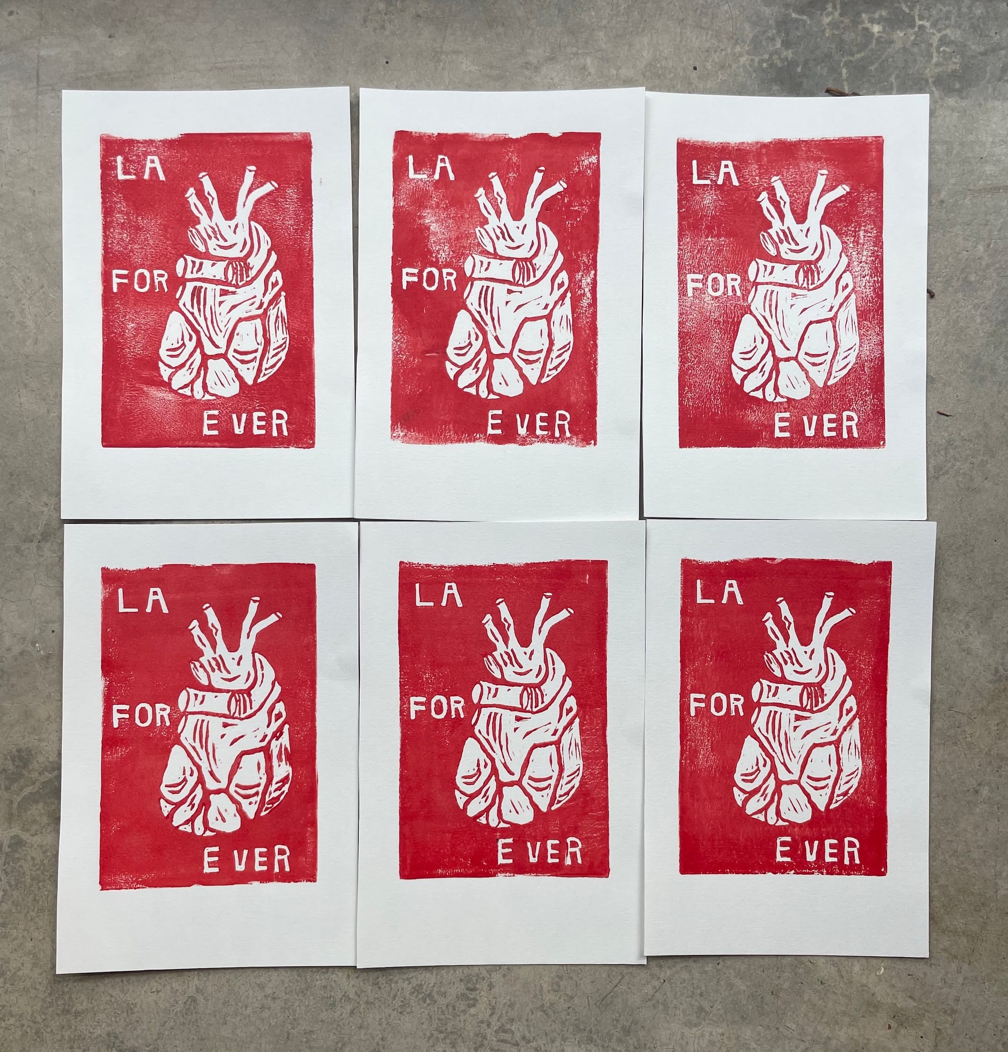 Outside LA, artist and recent Columbia University graduate Lolo Dederer has been selling linocut prints on her Instagram account since Friday, January 10. Dederer, currently based in Washington, is asking for donations of a minimum of $10 in exchange for her prints, which depict a human heart with phrases such as “LA Forever.”