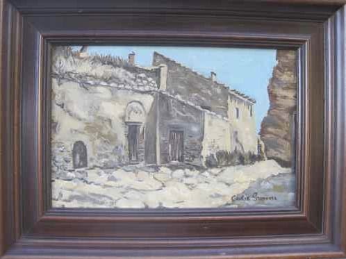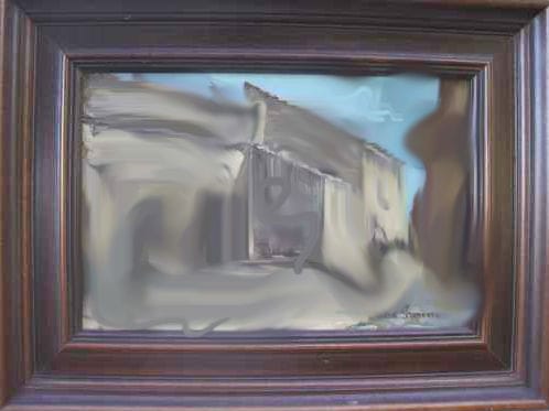 The painting is titled “Las Bodegas de Borja,” after the small town in which both Gimenez and the victim of her lucky restoration reside. Dated 2000, the rustic landscape has little in common with the artist’s more recent work, which may come as a surprise — Gimenez is fully capable of painting non-blurry, semi-realistic subjects.