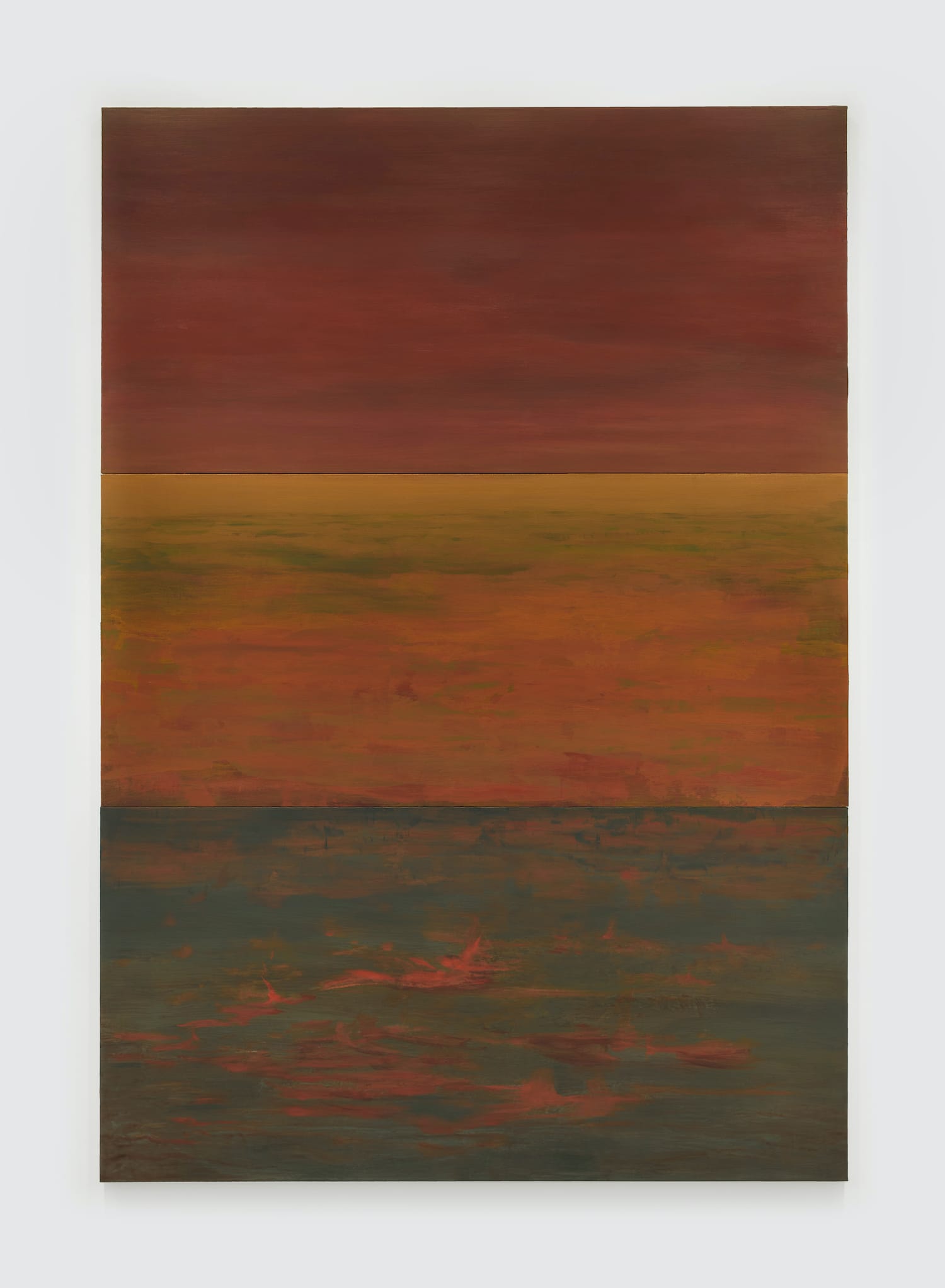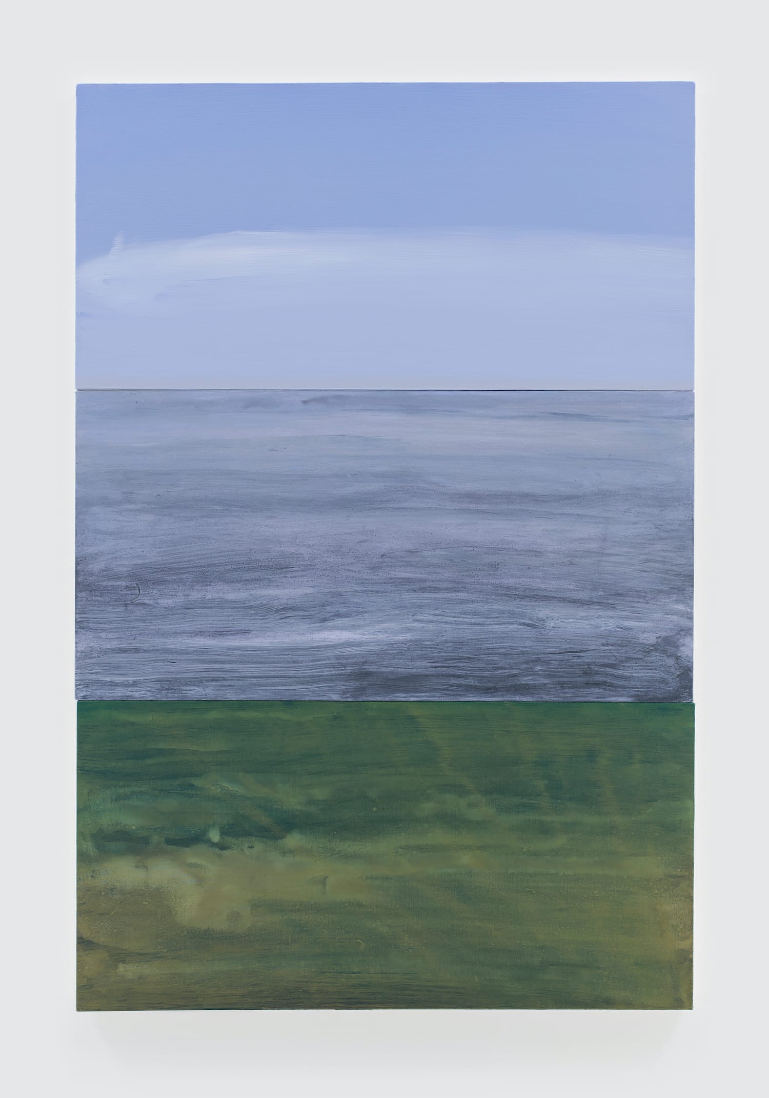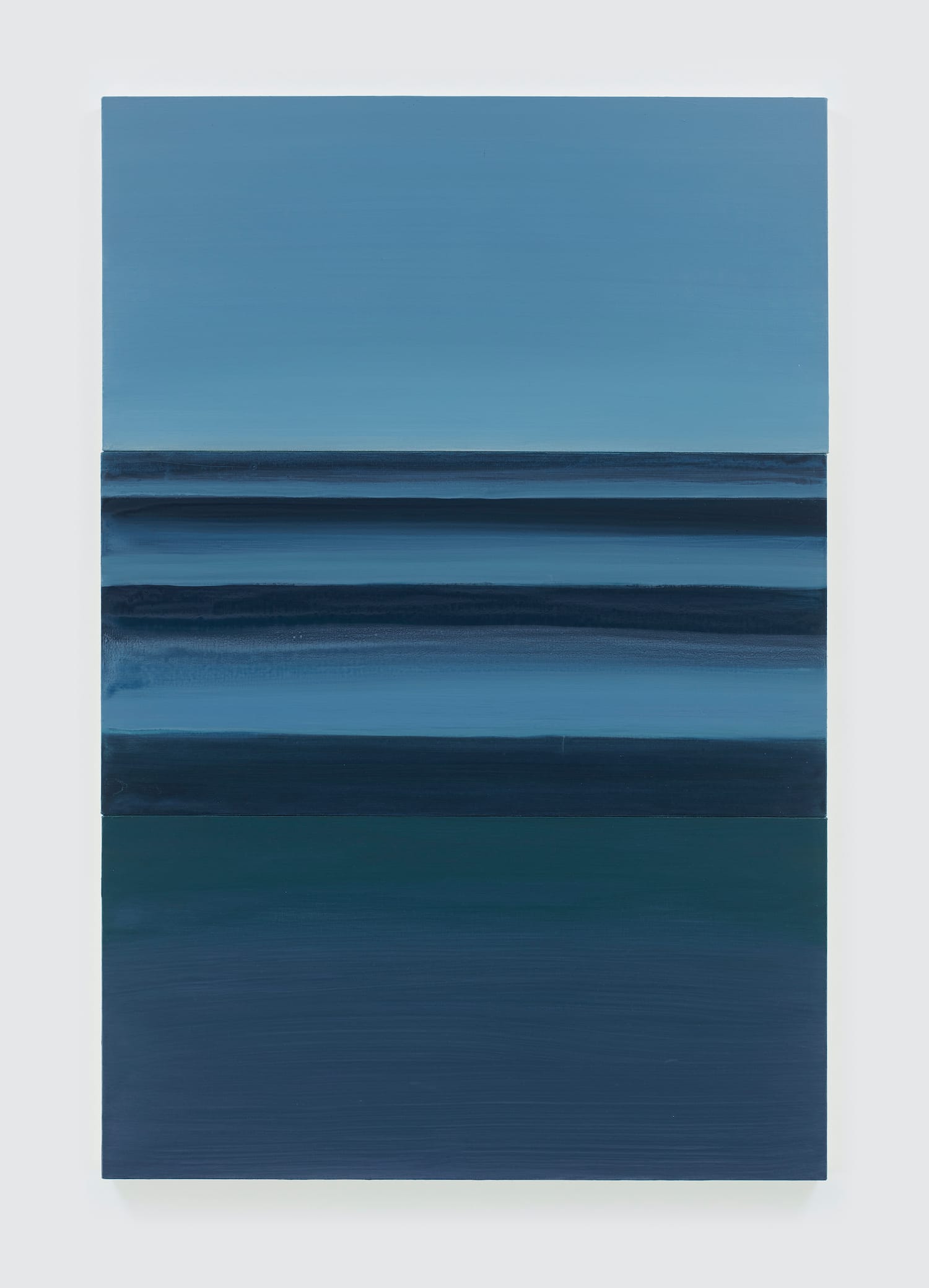 Each painting consists of three equally sized panels stacked vertically, with the top signifying the sky, the middle evoking the ocean, and the bottom panel conveying what is beneath the ocean’s surface. Kim stated in the press release: