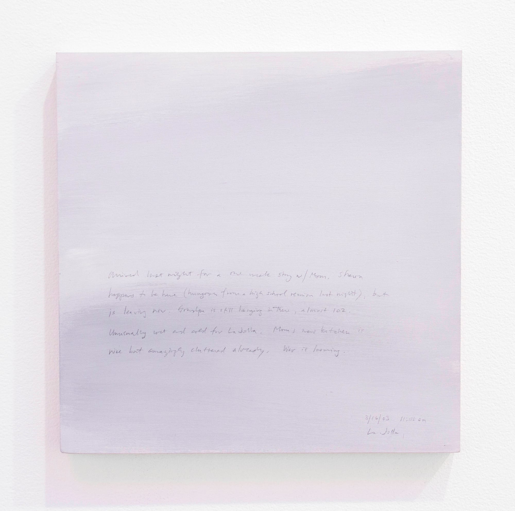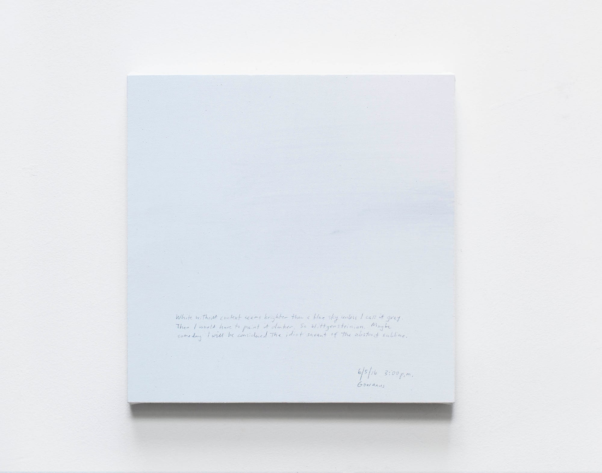 At James Cohan Gallery, Kim’s Selected Sunday Paintings, 1/7/01 to 2/11/18 complicates any oversimplifications of his career. The exhibition, which contains nearly 100 paintings, is the largest presentation yet of a series that has been ongoing for over 15 years; as such, it allows us to consider an underappreciated but essential strand of Kim’s life work. I say “life work,” rather than “oeuvre” or “output,” because, in aggregate, the series turns out to be a tour de force of accidental autobiography. Every Sunday since 2001, Kim has produced a 14×14-inch acrylic painting that depicts a slice of sky — blues and whites predominate, with occasional washes of gray — and contains a small observational paragraph handwritten on the canvas. Reading through the paragraphs from start to finish provides an unexpectedly poignant bird’s-eye view of Kim’s life — the youth soccer games, the dinner parties, the glum and the optimistic moods, the children going away to college.