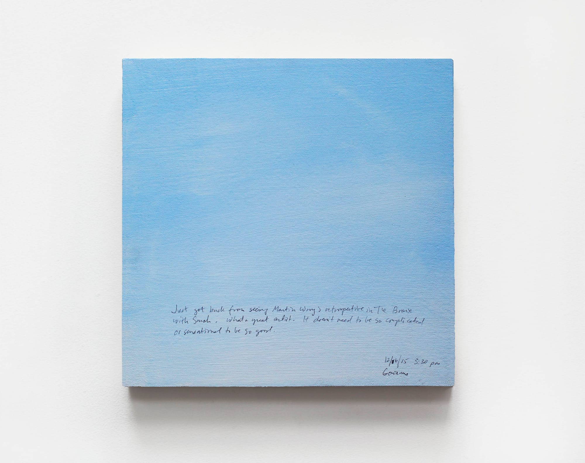 In addition to providing cosmic perspective on life, Kim’s Sunday Paintings, in their incorporation of writing into painting, also provide perspective on the artist’s aesthetic. In themselves and in comparison with one another, his minimalist painting series’ are far from one-note exercises in figurative abstraction. With an economy of aesthetic means, each series conveys surprising depth of thought and range of emotion. In the Sunday Painting, “12/6/15,” Kim has just returned from viewing The Bronx Museum’s Martin Wong retrospective and gushes, “What a great artist. It doesn’t need to be so complicated or sensational to be so good.” The observation applies to Kim’s work as well. Few artists manage to do more with less.