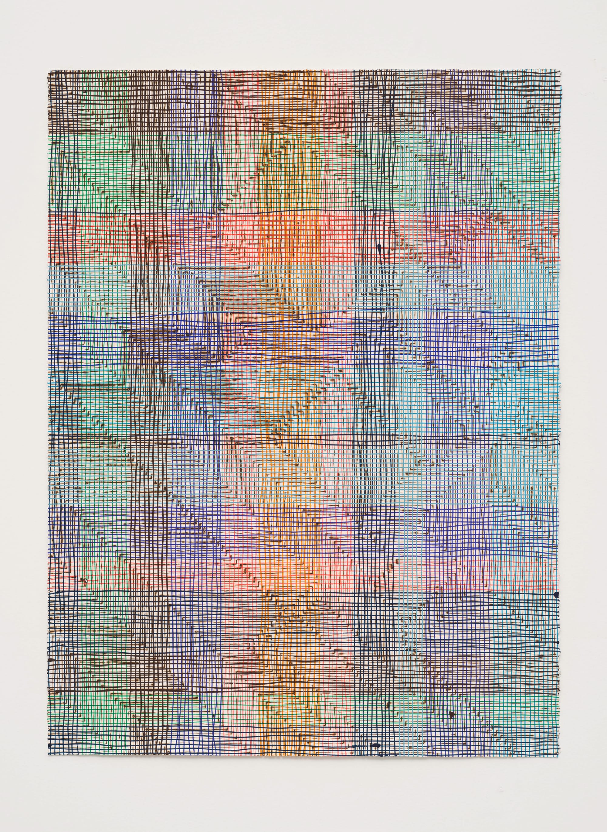 By placing the burnt lines next to those in acrylic ink, with very little space between them, de Almeida achieves a dense weave. While the lines are different colors, the burn marks are all brown. He uses each medium to form a different pattern, and yet one does not seem superimposed over the other.