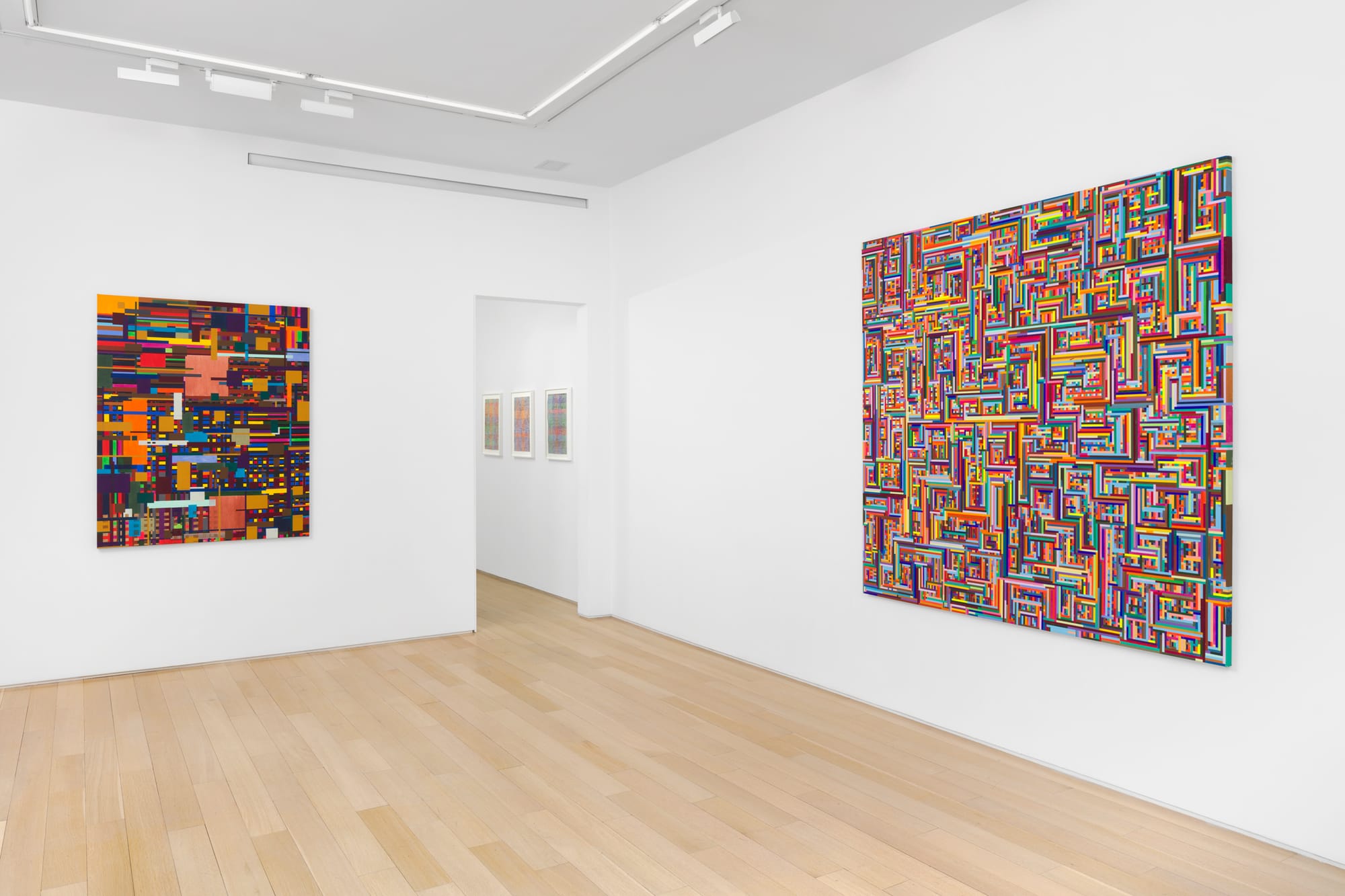 Two different memories came to mind while I was looking at the brightly colored abstract paintings and beguiling works on paper in the exhibition Caetano de Almeida, at Van Doren Waxter (March 25–May 15, 2021), which, according to the gallery, is de Almeida's first New York exhibition in almost five years. The first memory was of a podcast hosted by Charlotte Burns in 2017. Her guest was the artist, critic, and curator Robert Storr. In discussing his feelings about the terms globalism, cosmopolitanism, and internationalism, Storr stated:
