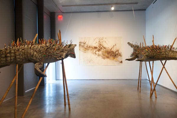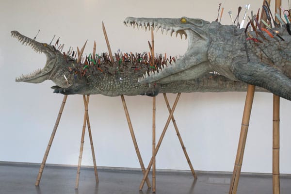 PROVIDENCE, RI — Cai Guo-Qiang’s Move Along, Nothing to See Here opened last Friday at the Cohen Gallery at Brown University in Rhode Island. The inaugural event for Brown’s “Year of China,” the exhibit includes work common to Cai’s oeuvre. The main sculptural work of the show, “Moving Along Nothing to See Here” (2006), has a title comprised of a phrase we commonly hear used by policemen at a crime scene. It consists of two life-sized crocodiles, supported by wooden stills, their jaws wide open and writhing in pain. Hundreds of small hand knives, utensils, box openers and blades taken from the security checkpoints of New York airports are stabbed into their scales.