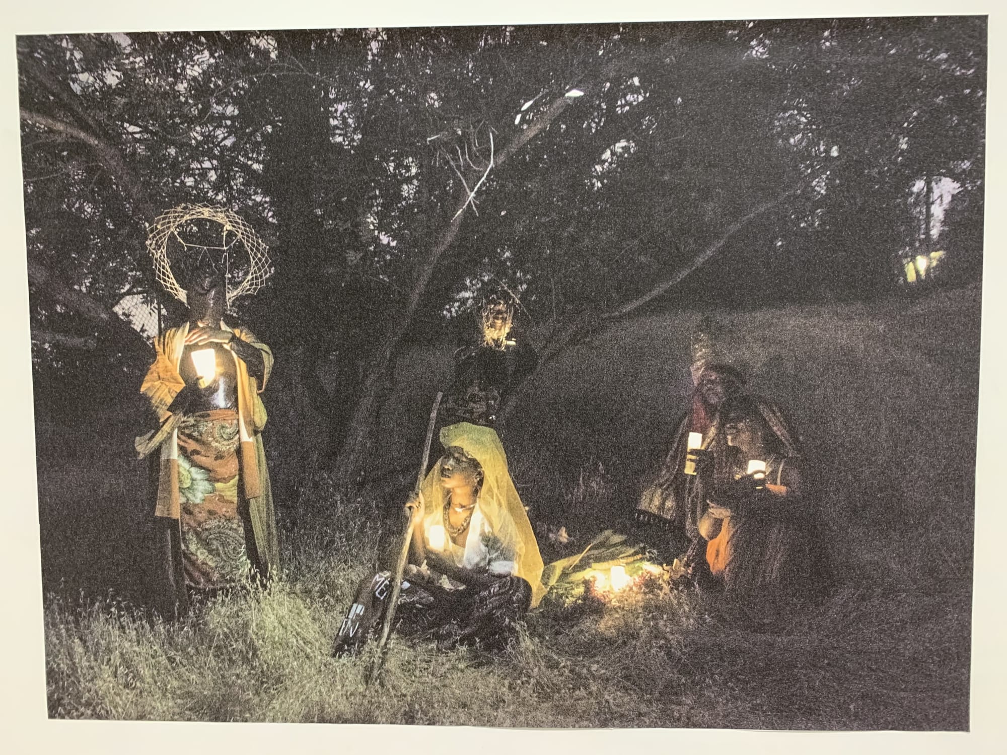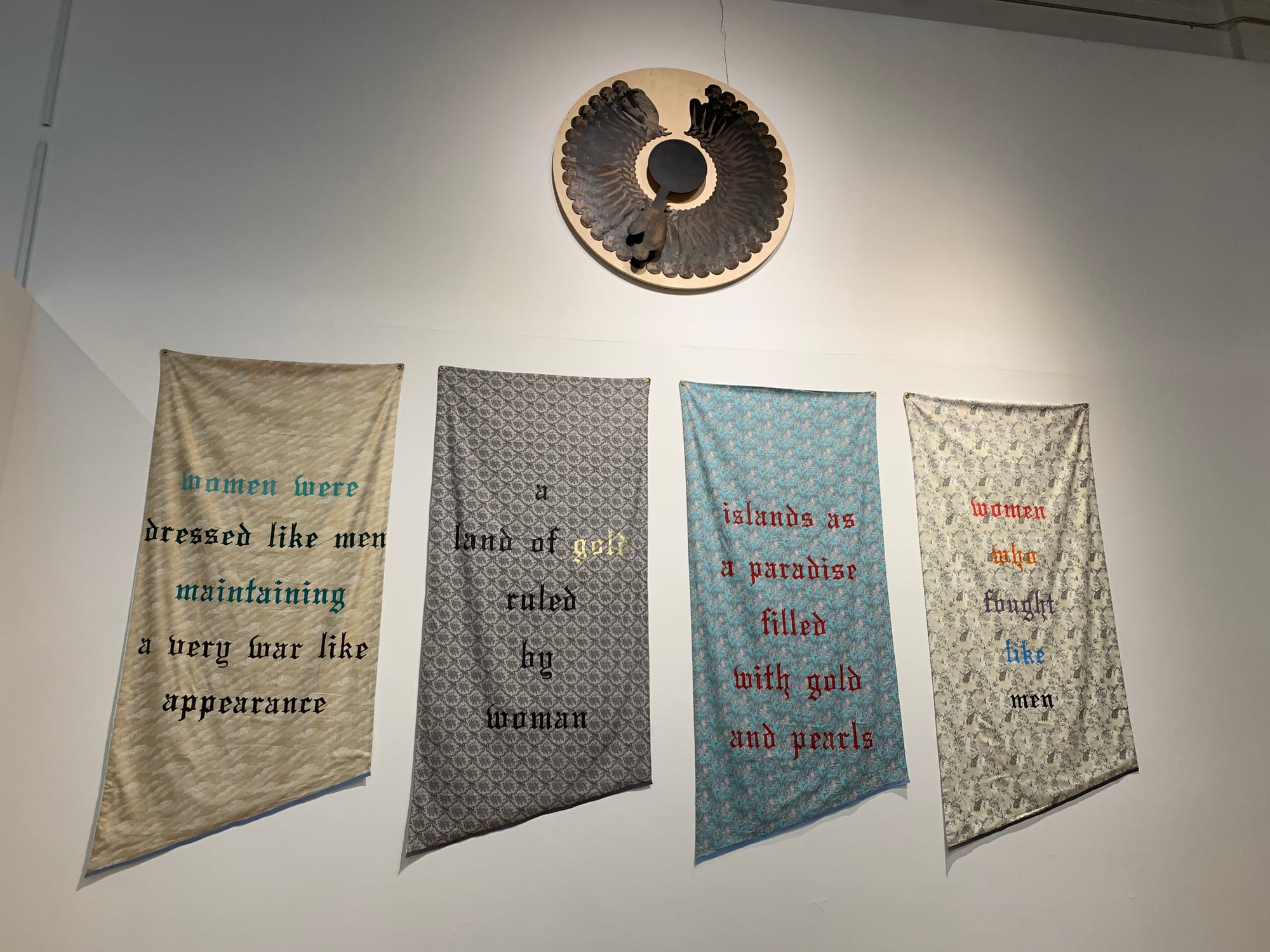 Several artworks in the exhibition reimagine the Calafia myth as a symbol of women’s strength and agency. The artist collective #SNATCHPOWER, for example, stages a futurist matriarchal society of Black women in an image from their short film Channeling Calafia (2018), while Mely Barragán’s series of banners, “Fact for Fiction” (2018), re-appropriates translated quotes from Las sergas de Esplandián as celebrations of powerful, militant women.