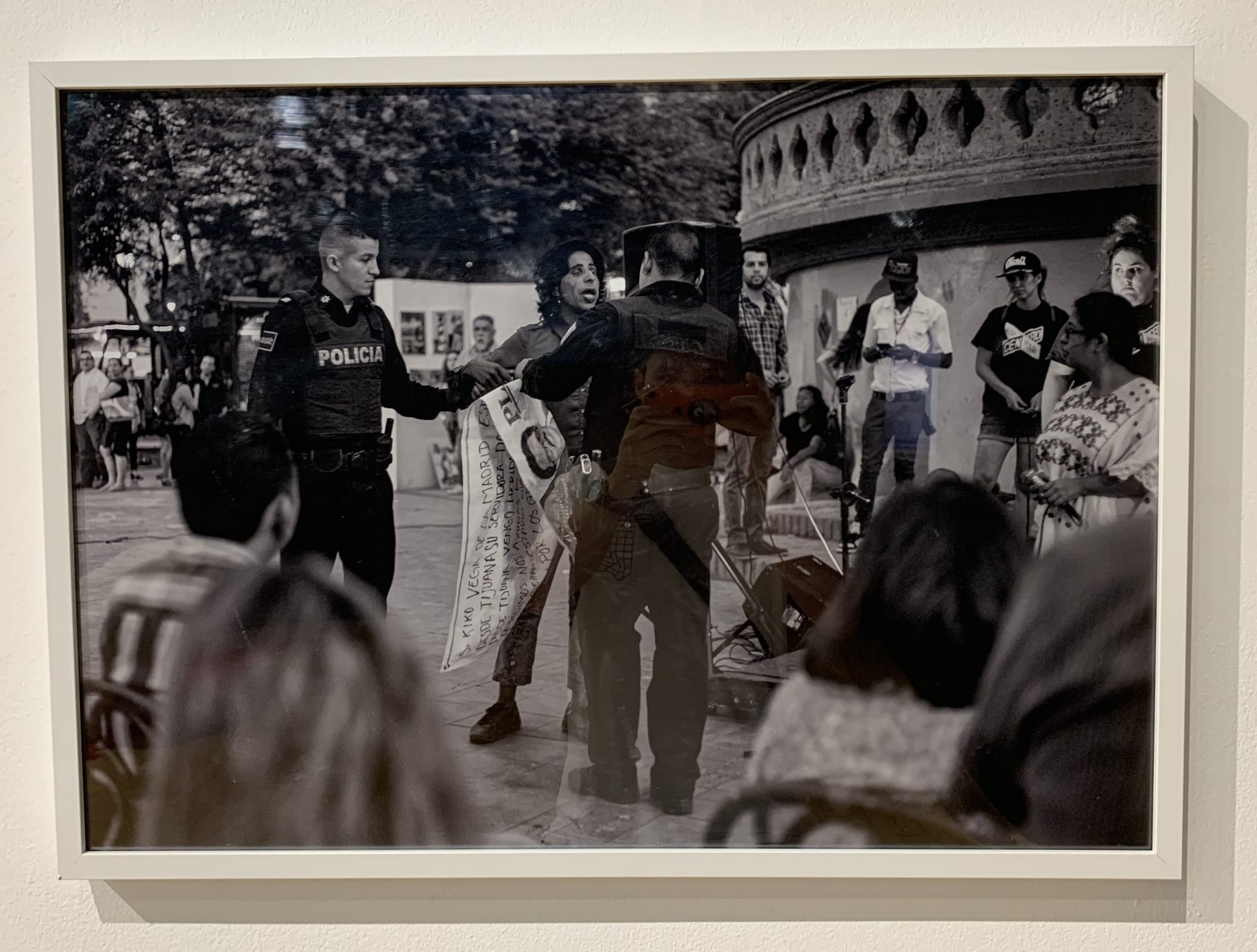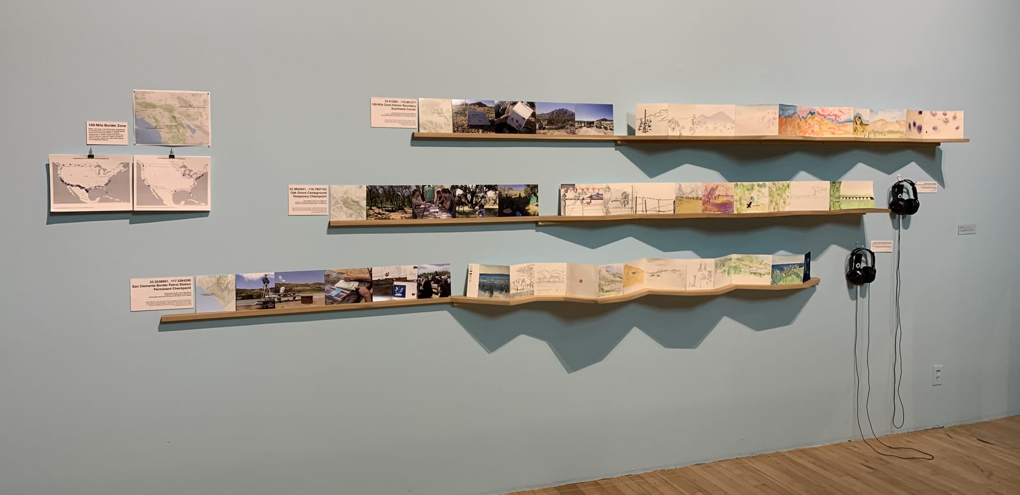 These utopian visions are displayed alongside works addressing the militarized and dystopian realities of US and Mexican borderlands. Paulina Sánchez’s photographs capture the lives of migrants in Mexicali, the capital city of Baja California, where duty-free factories allow American companies to take advantage of cheap labor in the production of goods to be shipped back across the border. Hillary Mushkin’s “Incendiary Traces: Three Border Ecologies” (2019) project documents artistic and public responses to checkpoints and border patrol stations that dot Southern California landscapes within 100 miles of the border. Drawings and watercolors map instances of warrantless searches and militarized surveillance near state-protected wilderness, while interviews with advocates from immigrant rights coalition Alianza Comunitaria describe the support networks established to help respond to raids and checkpoints by federal agencies.