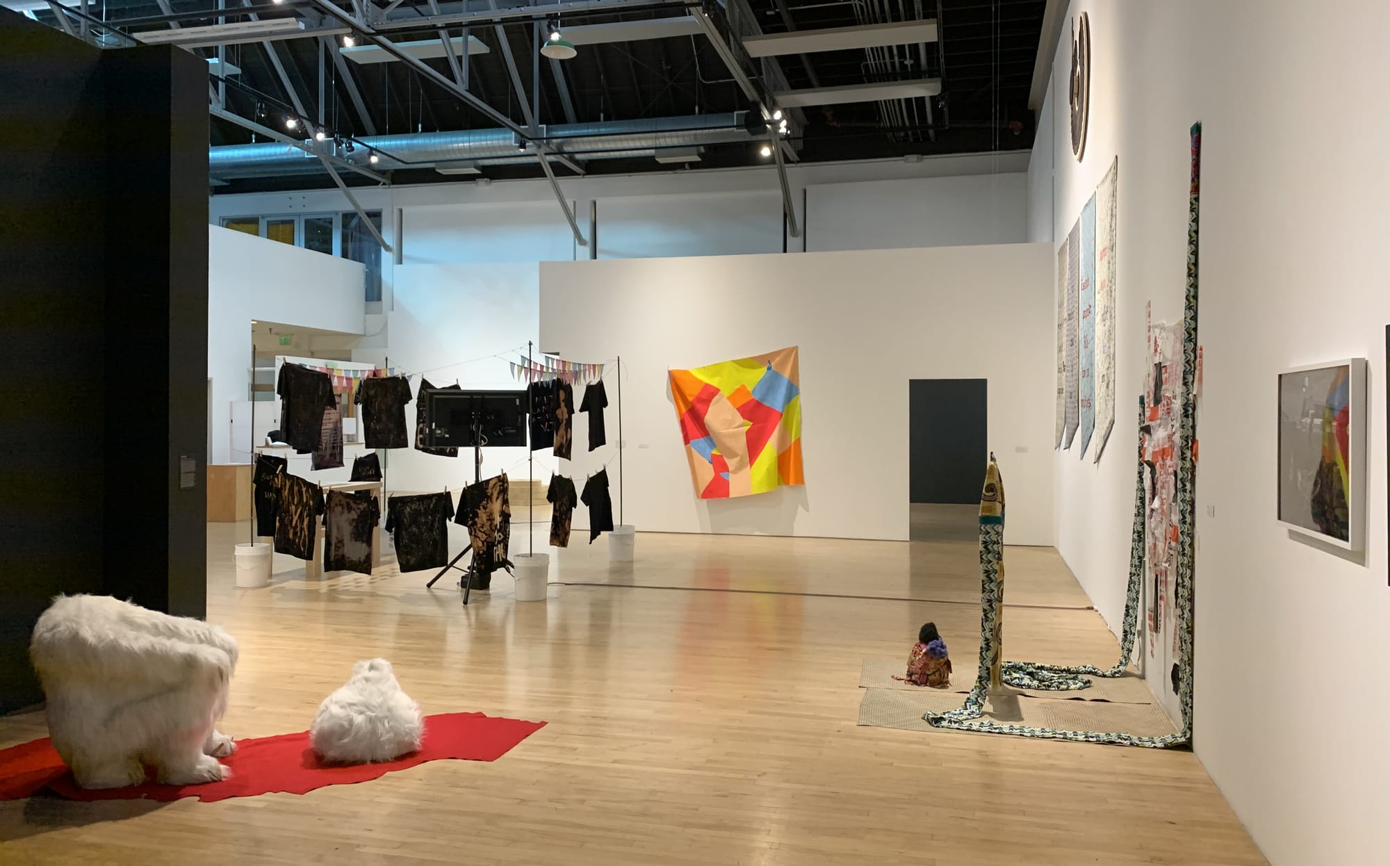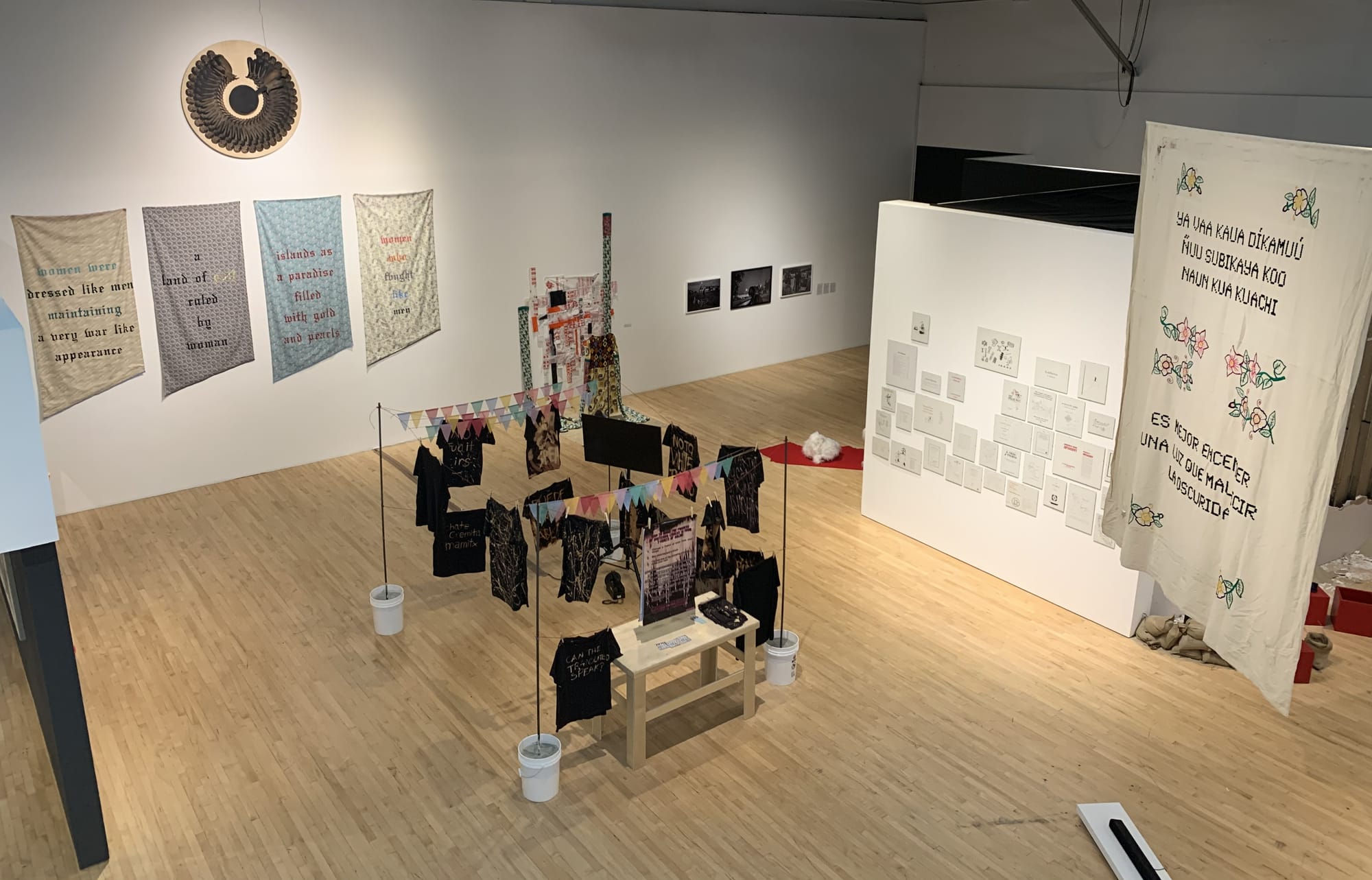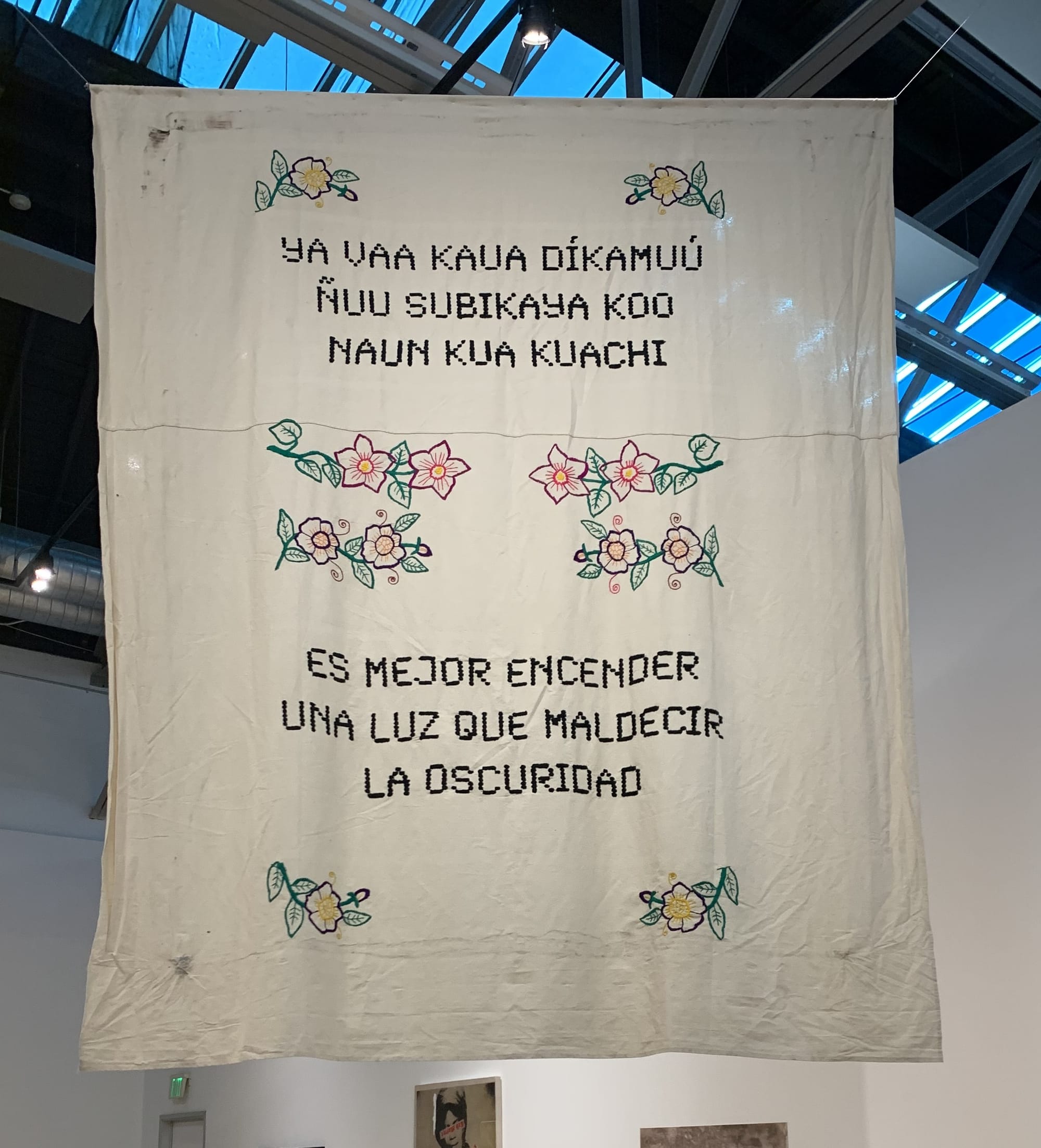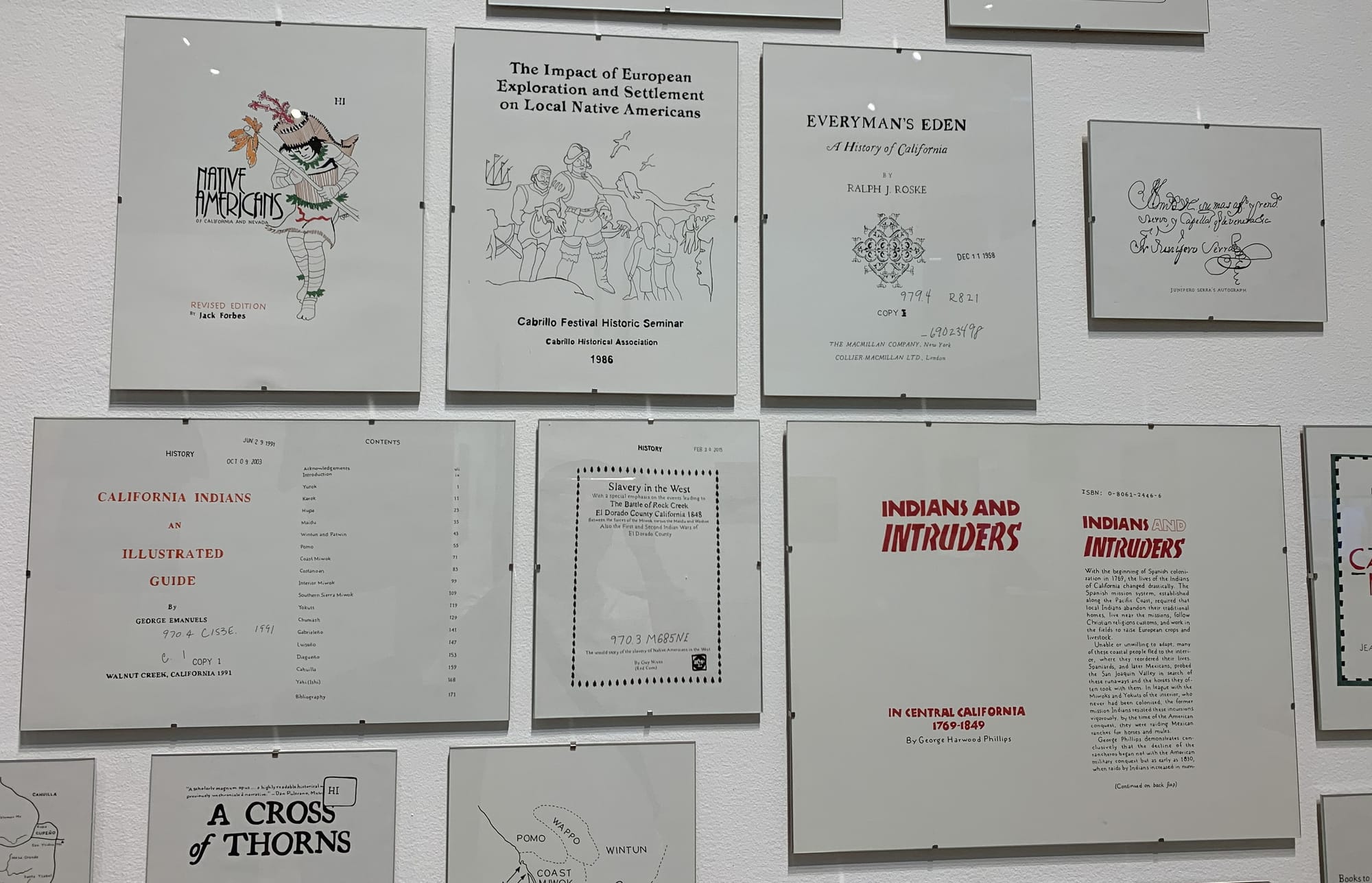 The real-life histories and lives of indigenous people living in the Californias are the focus of the Cog*nate Collective’s bilingual audio and embroidery installation, produced in collaboration with Mujeres Mixtecas, a cooperative of indigenous Mixtec women living and working in the border city of Tijuana. Nearby, Monica Rodriguez’s Californiana (2019), a series of ink drawings on paper, reproduces covers and pages from 20th-century books about early California history, books with titles like Indians and Intruders and Women and the Conquest of California, published in service of legitimizing the expansion of American empire.