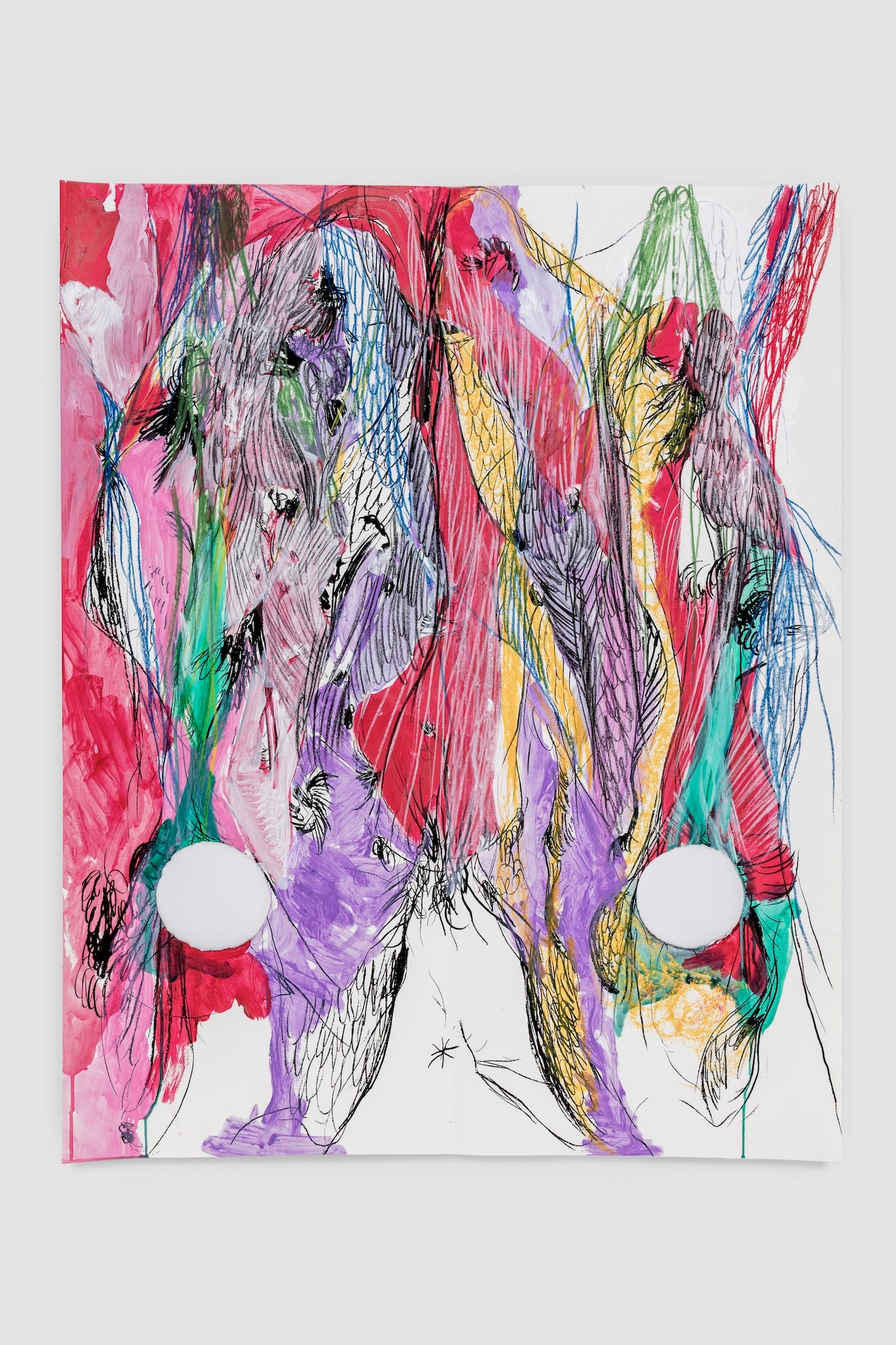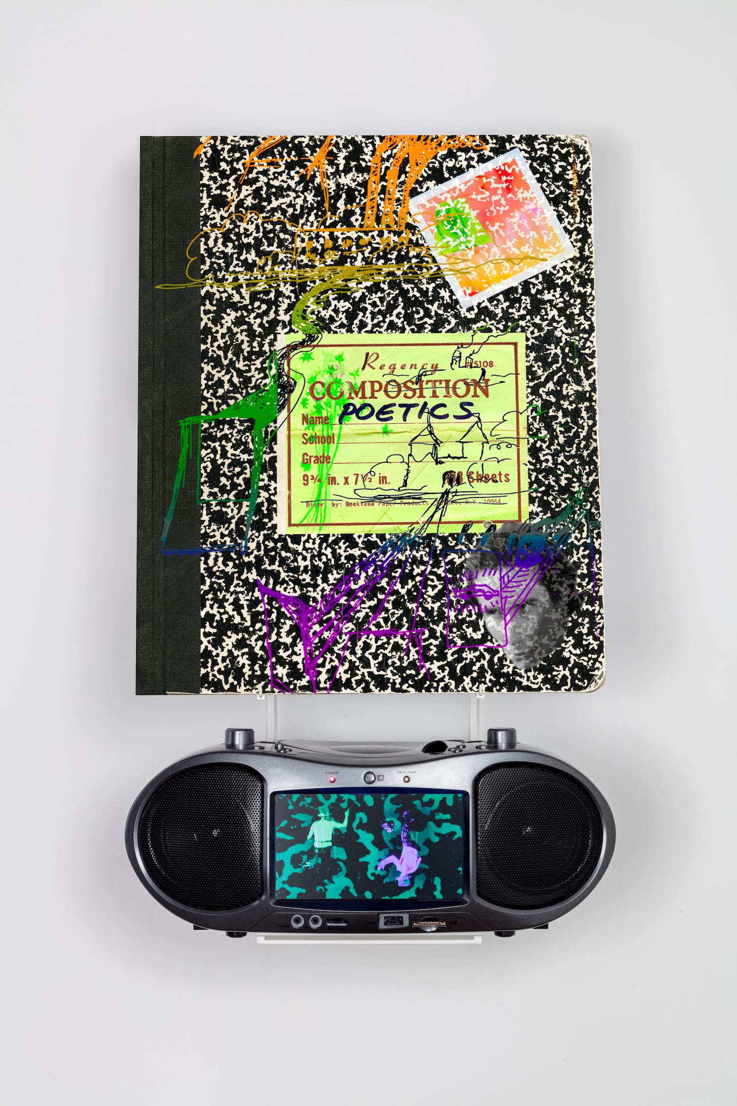 Oursler met fellow American artist Mike Kelley at CalArts in 1976, where the pair immediately hit it off and formed a band that gave way to the experimental collaborative group The Poetics. Each edition of his shelf sculpture “Lucky Charm” (2019), Oursler’s commission for 50+50, includes a boombox that plays a video compiled from previously unseen footage produced by Kelley and Oursler and a uniquely designed composition notebook, an icon of the era and symbolic of the group’s early days.
