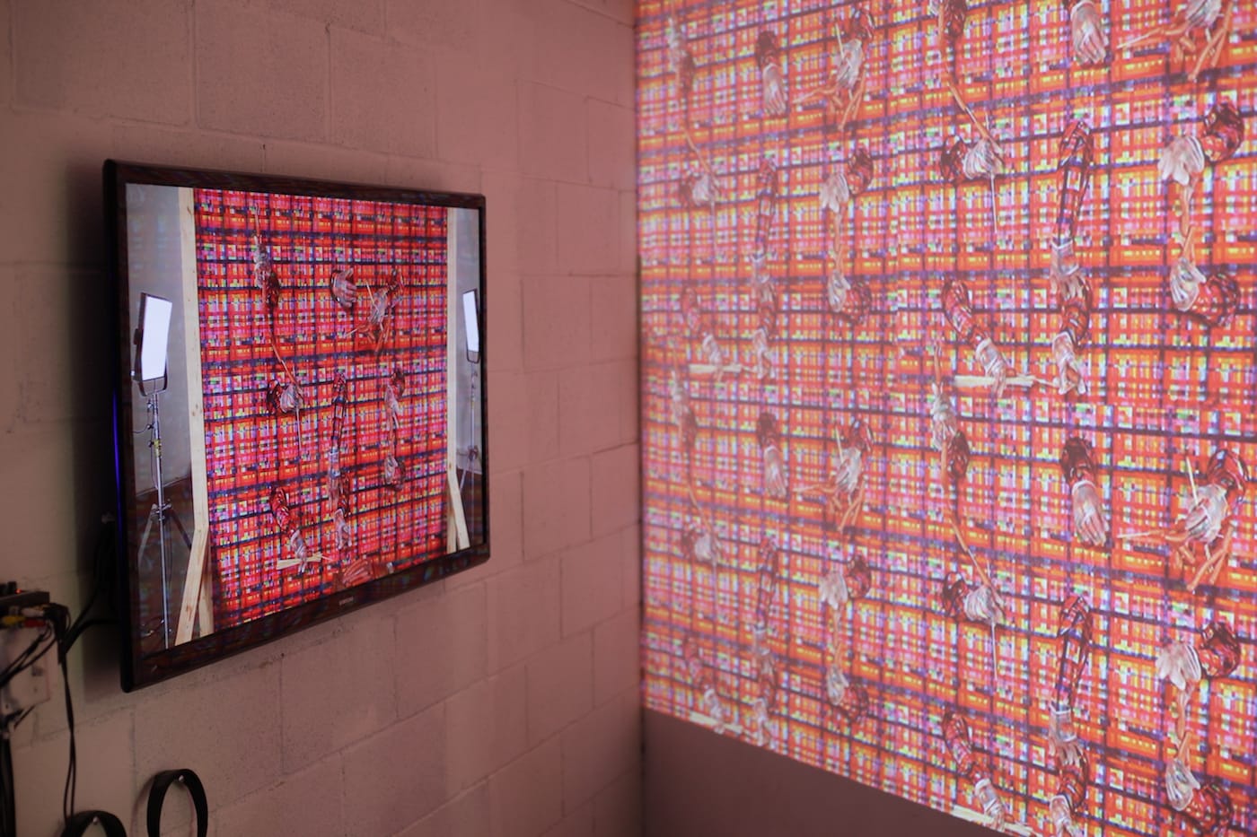 “Predictive Text! Backscratcher! Stacks! Light Touch Heavy Handed! Biohackin’!” refers to the five games continuously enacted on screen by five human participants, whose bodies are manipulated by Render’s hand-crafted furniture, concealed by a marquee of tartan fabric punctured with holes for their hands to emerge from. The furniture forces their bodies to perform in a particular way, establishing “an index of capabilities and limitations within the individual’s body,” as Render explains it. In one instance, the five participants attempt to connect a pipeline of wiener-dogs on skewers with only their hands visible through the marquee, meaning they’re blind to one another’s progress; they must operate as multiple but interconnected mechanized limbs attached to a singular mind-body. Render cites Benjamin Bratton’s The Stack as a touchstone here, a text which proposes an architecture of internet sovereignty in which the “user” is caught in a paradox between incentivized hyper-individuation (profiles, Instagram, curated identities) and ultimate pluralization (the algorithms that dictate their currency).